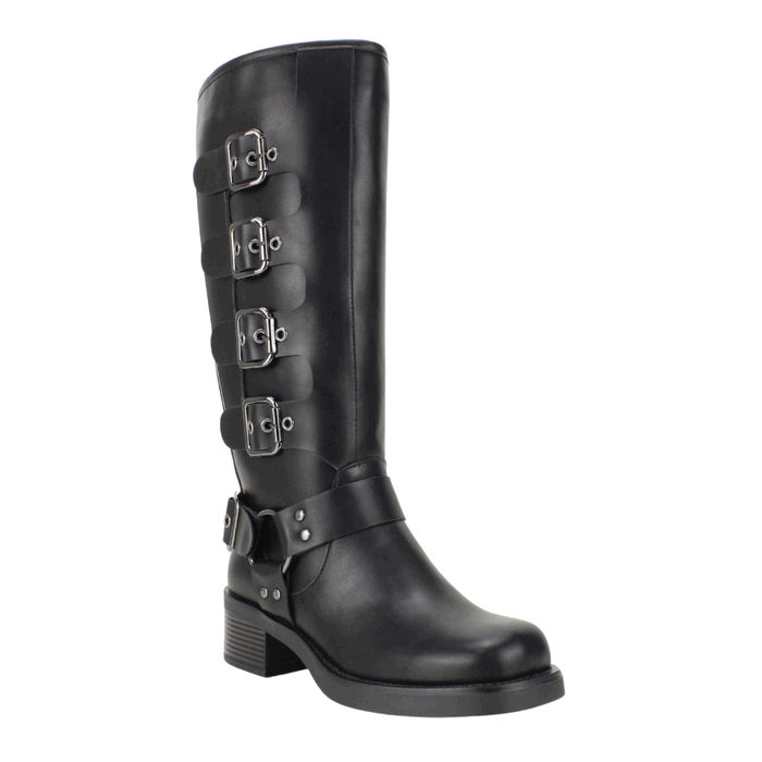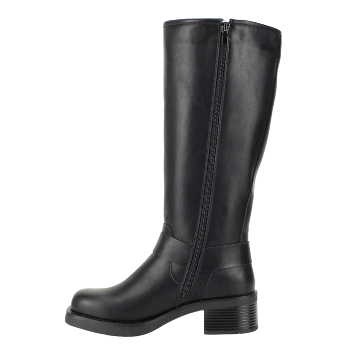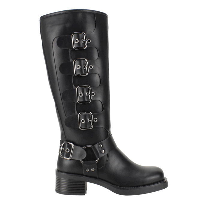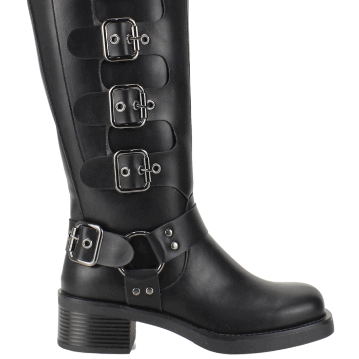 Bota de Mujer Agua de Coco negra. Estilo Biker. Descubre esta impresionante bota alta de cuero sintético negro con un diseño audaz y detalles de hebillas metálicas. Su estilo biker y suela resistente la convierten en la opción ideal para quienes buscan un look rebelde y sofisticado. Perfecta para combinar con jeans ajustados o faldas, esta bota ofrece comodidad y durabilidad para cualquier ocasión. Ajuste mediante cierre en el costado interno. Taco cuadrado de 5 cm de altura, Plataforma de 1,5 cm de alto, Caña de 34 cm y Contorno de 35,5 cm de perímetro.