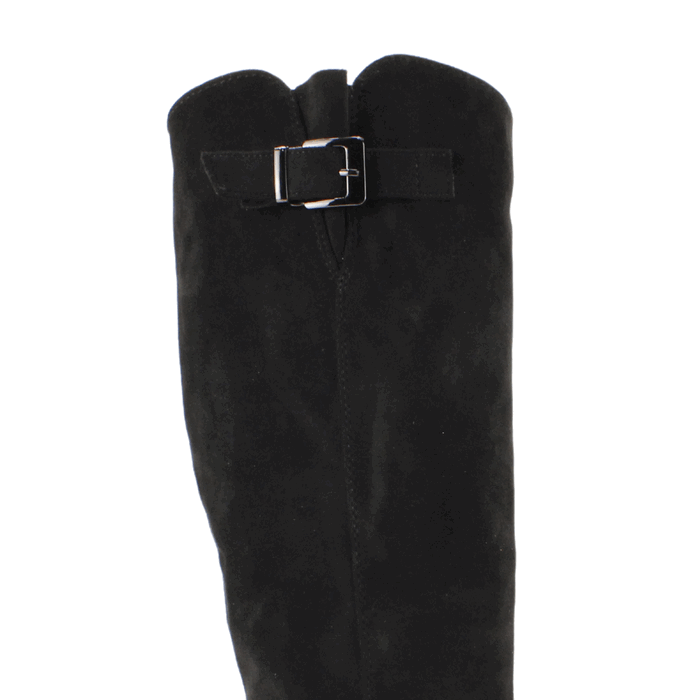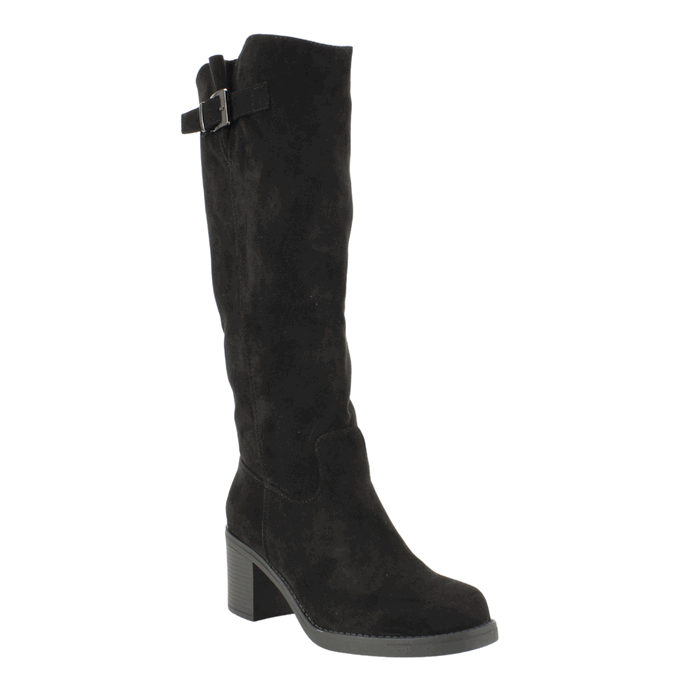 Bota de Mujer Agua de Coco color negro. Eleva tu estilo con estas elegantes botas altas en un sofisticado color negro. Confeccionadas en símil gamuza, estas botas destacan por su diseño clásico y versátil, perfecto para cualquier ocasión. El tacón medio y ancho proporciona comodidad y estabilidad, ideal para el uso diario. El detalle de la hebilla en la parte superior añade un toque de distinción. Taco Cuadrado de 7 cm de altura, caña de 35 cm de alto y contorno de 33,5 cm.