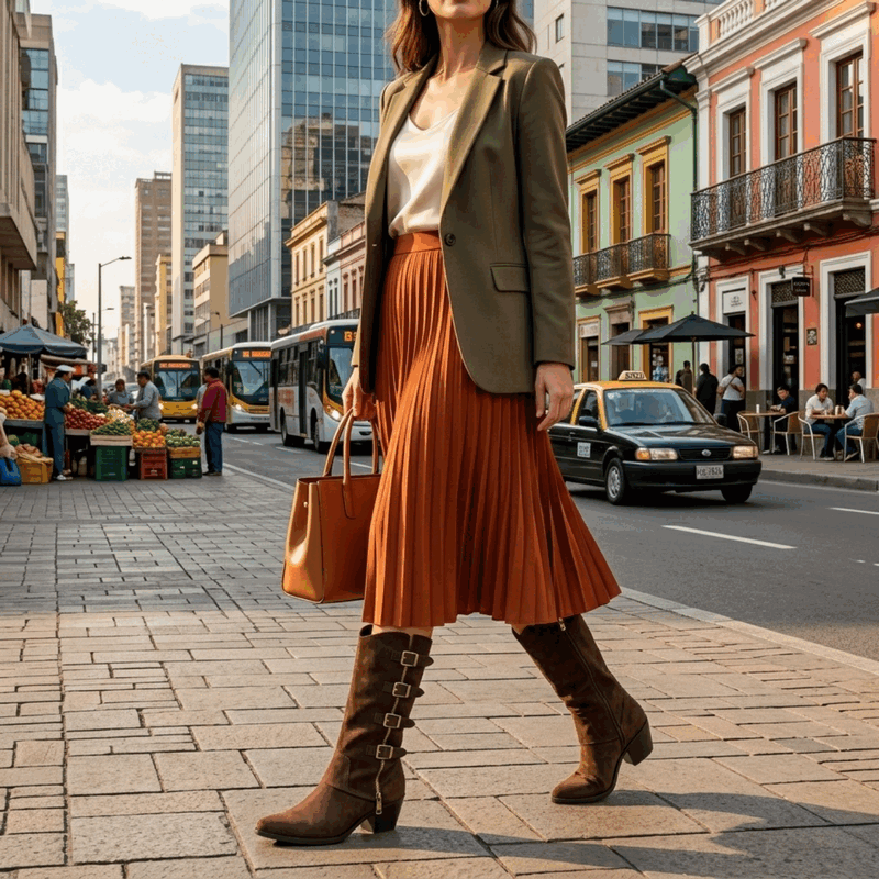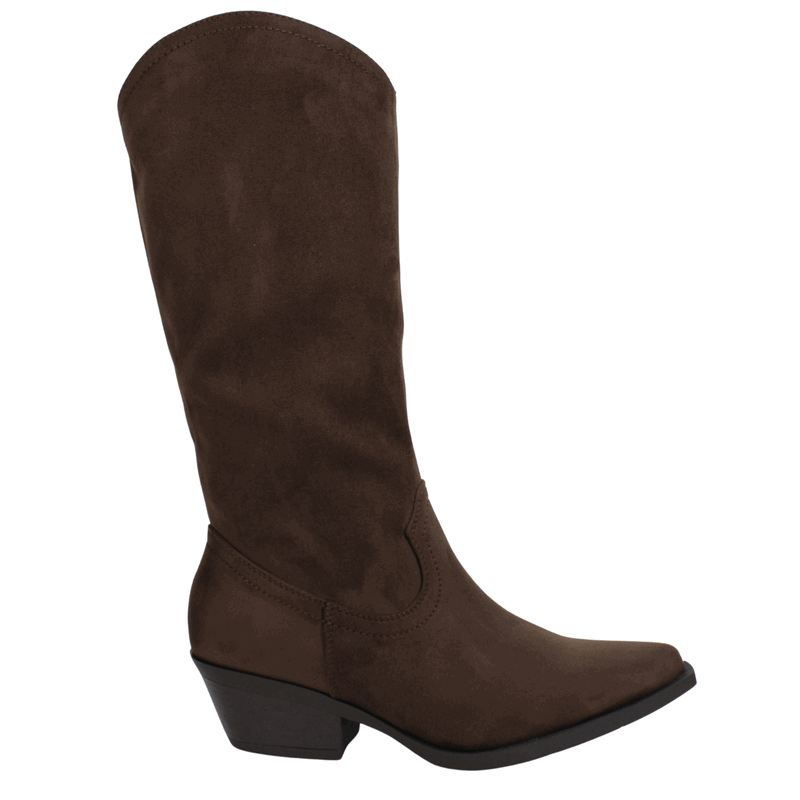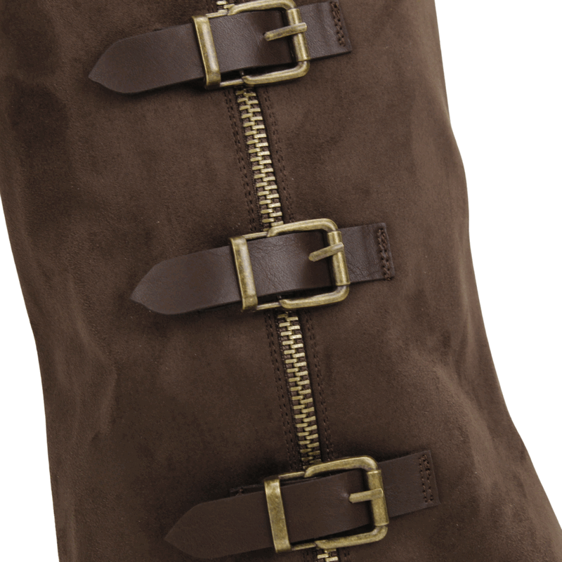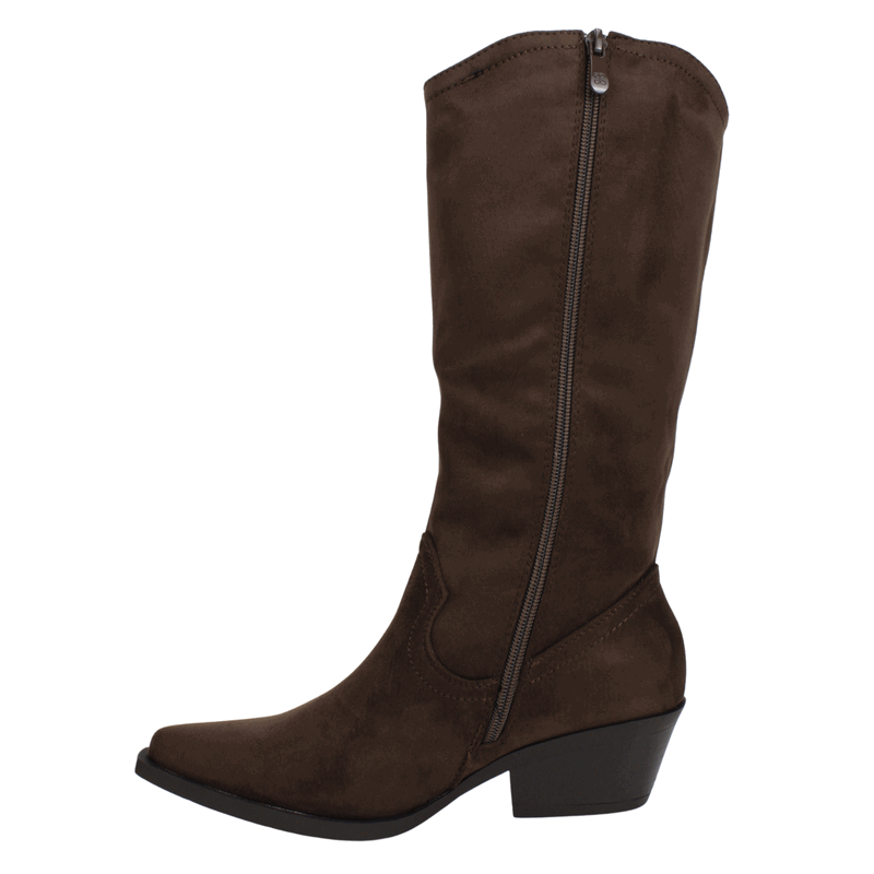 Bota de Mujer Agua de Coco color café. Estilo Vaquera. Esta bota alta de mujer destaca por su diseño versátil y sofisticado, ideal para quienes buscan un calzado con carácter y múltiples opciones de estilo. Confeccionada en un material símil gamuza, presenta una silueta inspirada en la tendencia vaquera con una punta fina y un taco bajo de base ancha que asegura comodidad durante todo el día. El detalle distintivo es su panel exterior desmontable mediante un cierre lateral, el cual está decorado con cuatro hebillas metálicas plateadas de estilo urbano; al retirarlo, la bota se transforma en una pieza minimalista y estilizada. Perfecta para combinar con jeans ajustados o vestidos, este modelo es un básico imprescindible para la temporada otoño-invierno que ofrece durabilidad y un ajuste seguro gracias a su cierre funcional interno. Ajuste mediante cierre interno. Taco Cuadrado de 5 cm de alto, caña normal de 27,5 cm y caña con broches de 29,5 cm de altura, contorno de 32 cm.