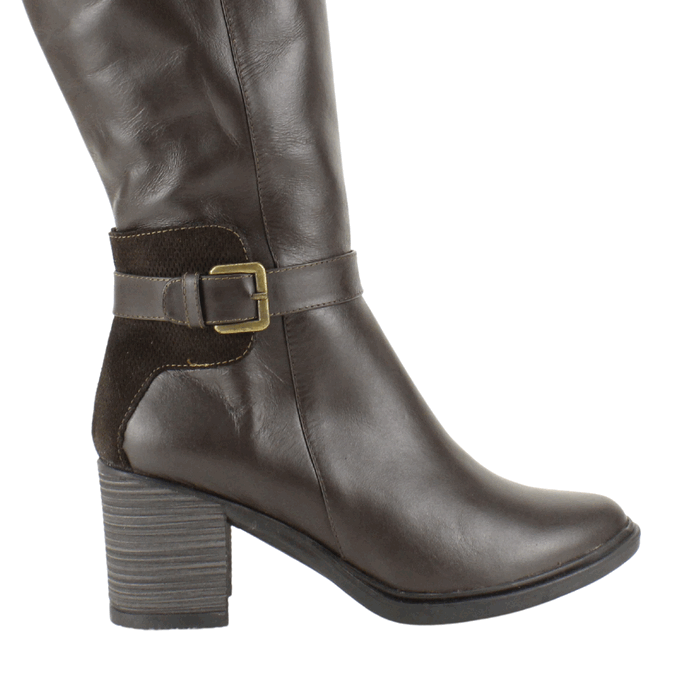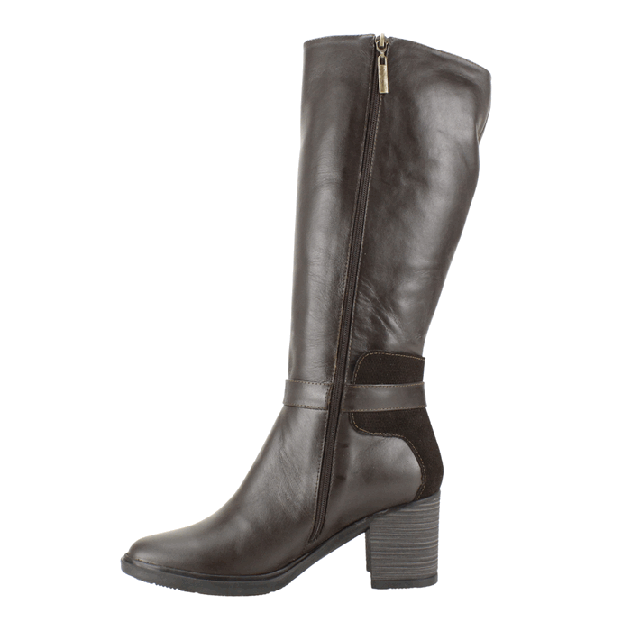 Bota de Mujer Exs de cuero café de fabricación colombiana. Estilo Casual. Eleva tu estilo invernal con nuestra bota larga de mujer en un sofisticado tono marrón chocolate. Fabricadas con cuero genuino de alta calidad, estas botas de caña alta ofrecen durabilidad y un ajuste cómodo. El diseño presenta un elegante tacón ancho y robusto que proporciona estabilidad y una altura ideal para el uso diario o eventos especiales. Un distintivo detalle de hebilla ajustable en el tobillo, que combina cuero liso con un inserto de gamuza suave, añade un toque chic y sofisticado. La cremallera lateral asegura un calce fácil y rápido. Perfectas para combinar con jeans, faldas o vestidos, estas botas de tacón cuadrado son ideales para la temporada de otoño-invierno, brindando calidez y un look atemporal. Ajuste mediante cierre en el costado interno. Taco Cuadrado de 7 cm de alto, caña de 33,5 cm de altura y contorno de 35 cm.