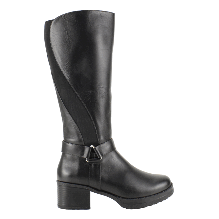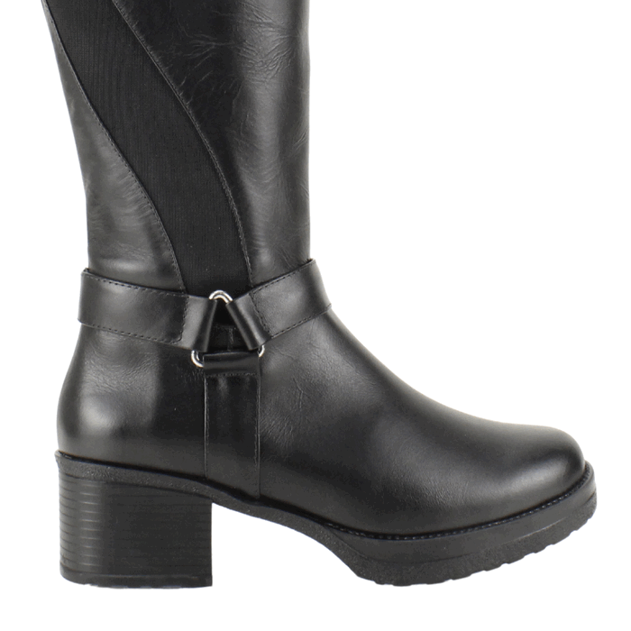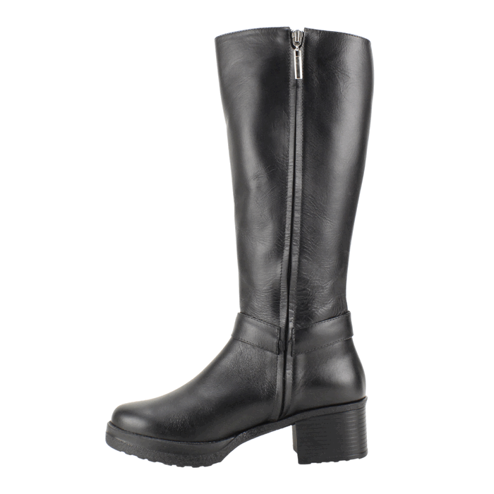 Bota de Mujer Exs de cuero negro de fabricación colombiana. Estilo Casual. Descubre la versatilidad y elegancia en cada paso con nuestra bota de cuero alta en color negro. Confeccionada en cuero de alta calidad, esta bota presenta una caña con panel elástico para un ajuste perfecto y cómodo. Su diseño se complementa con una discreta correa decorativa con herraje metálico y un tacón de bloque robusto que te brindará estabilidad y estilo. Ideal para el día a día o para elevar tus looks de invierno. Ajuste mediante cierre en el costado interno. Taco Cuadrado de 5,5 cm de alto y plataforma de 2 cm, caña de 34,5 cm de altura y contorno de 36 cm.