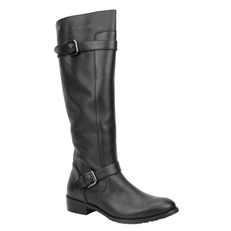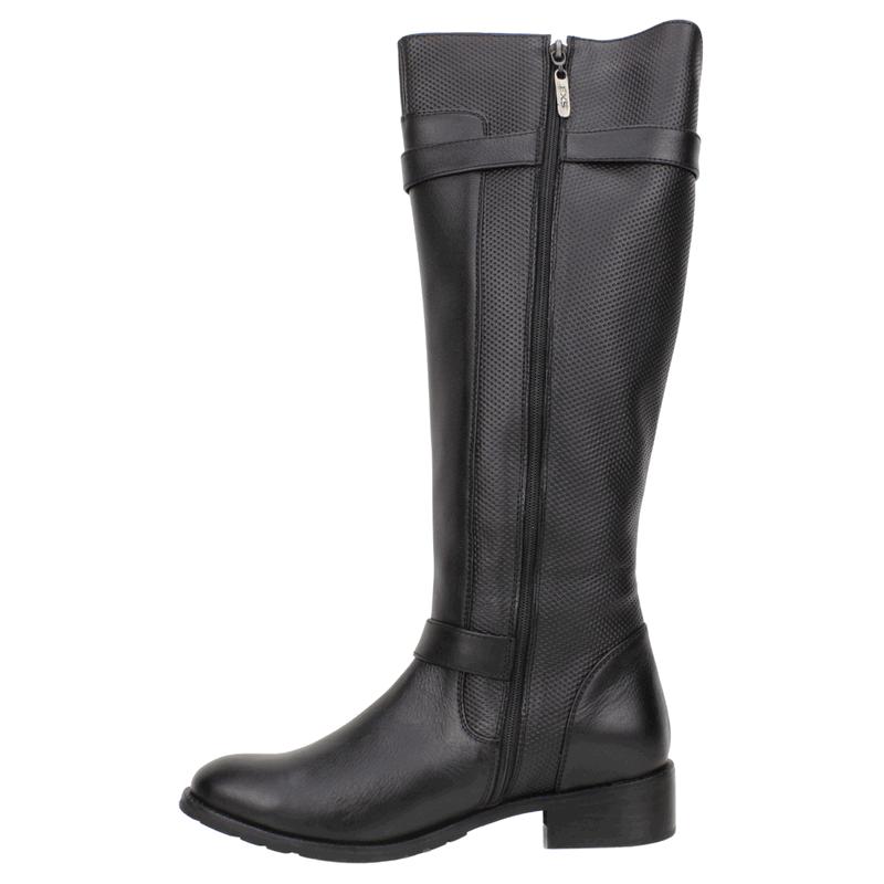 Bota de Mujer Exs de cuero color negro de fabricación colombiana. Estilo Biker. Eleva tu estilo invernal con estas sofisticadas botas altas de cuero negro, diseñadas para combinar moda y funcionalidad. Este modelo destaca por su elegante caña que llega hasta la rodilla, combinando una suave piel lisa en la parte inferior con un panel superior texturizado con microperforaciones, añadiendo un toque distintivo y moderno. Cuenta con dos correas ajustables con hebillas metálicas de color cañón, una situada estratégicamente en el tobillo y otra en la parte superior de la caña, que no solo aportan un aire motero y chic, sino que también permiten un ajuste más personalizado. Para mayor comodidad en el día a día, incorporan un práctico cierre de cremallera lateral completo. Con un tacón bajo y bloque muy cómodo, estas botas son la elección perfecta para lucir impecable en cualquier ocasión, ya sea combinadas con vaqueros, faldas o vestidos. ¡Hazte con este básico atemporal y marca tendencia esta temporada! Ajuste mediante cierre interno. Taco Cuadrado de 4 cm de alto, caña de 38 cm de altura, contorno de 37 cm.