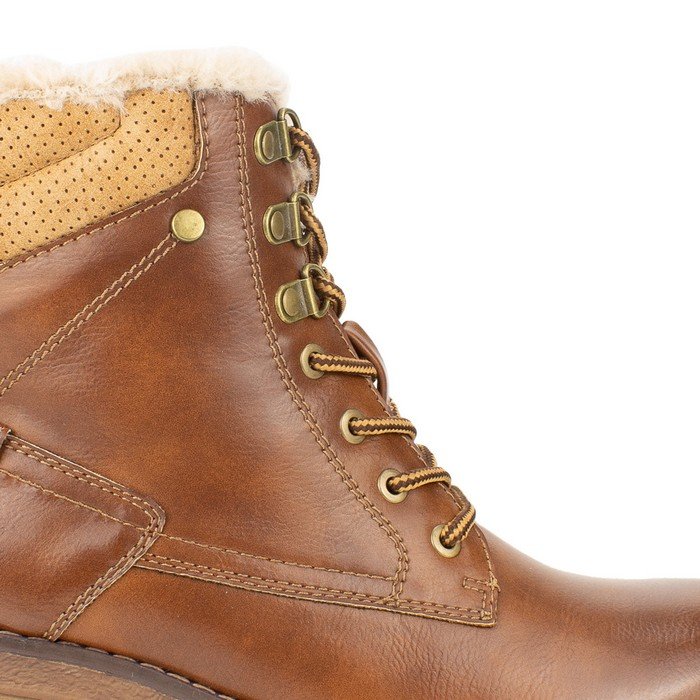 Botín Mujer Agua de Coco color Camel. Estilo Casual. Diseño tipo bototo con chiporro en el borde superior y forro de textil acolchado para un invierno calentito con ajuste mediante cordones al tono. Tipo de Cierre: Cierre. Forma de Taco: Cuadrado. Altura taco: 6 cm. Altura caña: 12 cm. Contorno 21 cm.