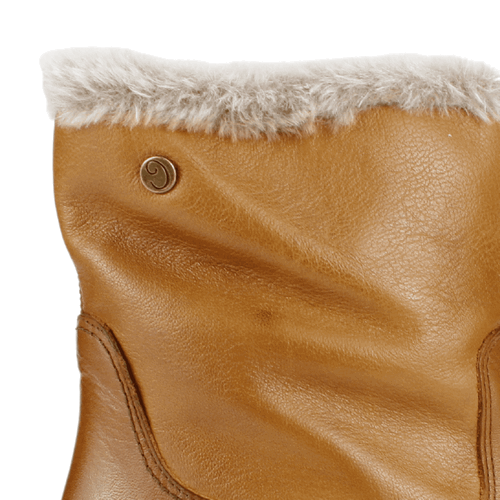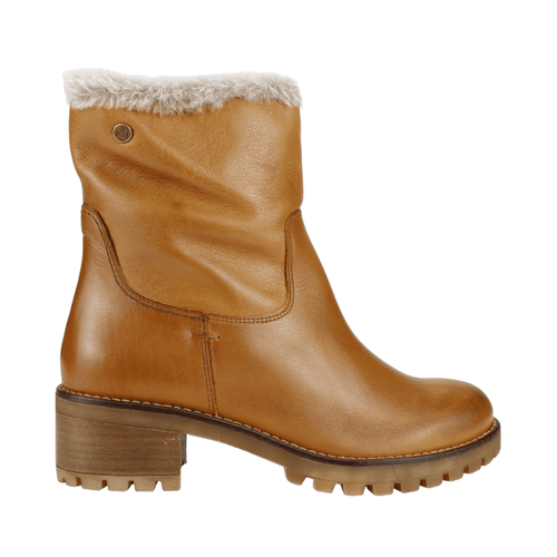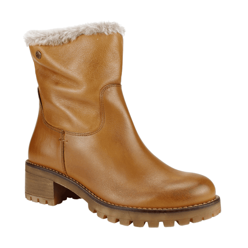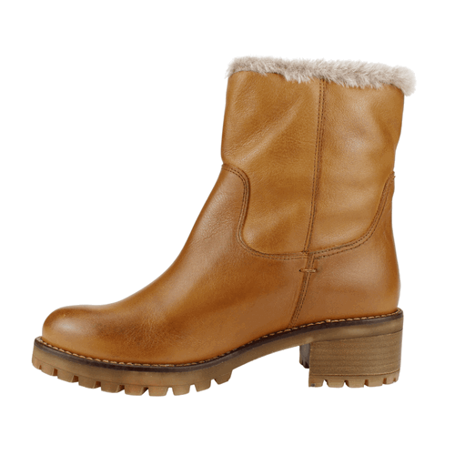 Botín Mujer Carmela de cuero color Camel. Fabricado en España. Estilo Casual. Capellada de cuero con textura lisa y detalle de chiporro en parte superior del calzado que se extiende hasta la mitad el forro interior. Taco cuadrado de 5 cm de altura y caña de 16,5 cm de alto. Contorno de 27 cm.