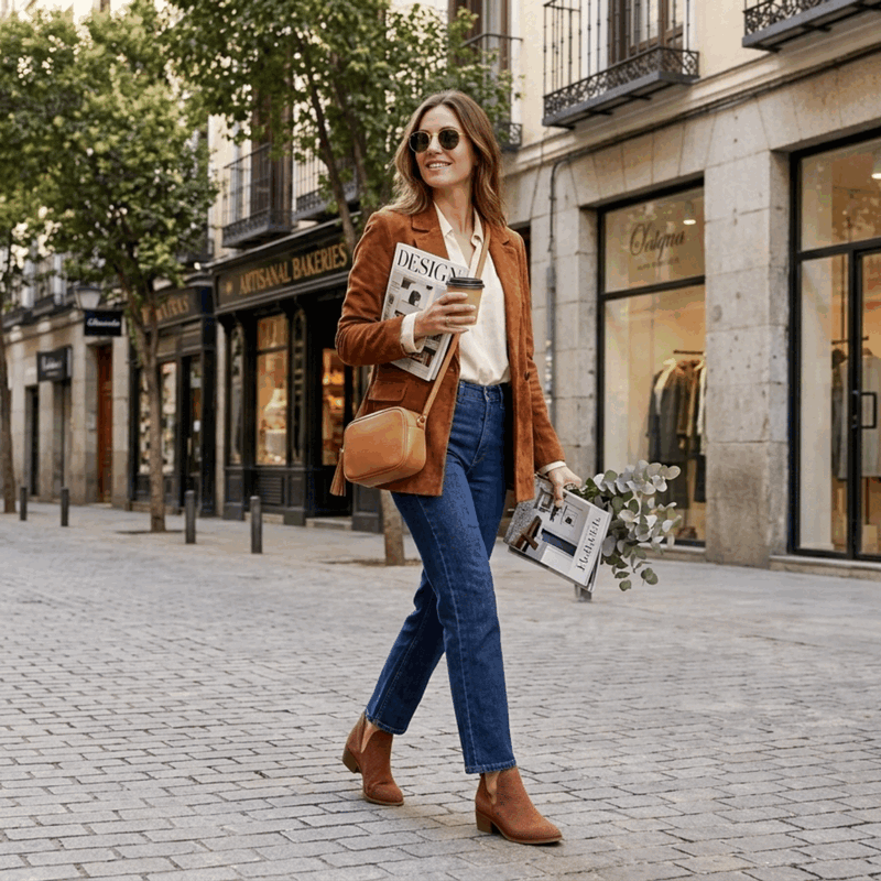 Botín de Mujer Exs de cuero Marrón. Fabricado en Colombia. Estilo Abiertos. Añade un toque de frescura y tendencia a tu armario con estos botines estilo «cut-out». Confeccionados en gamuza de alta calidad, presentan un acabado troquelado con micro-perforaciones que favorecen la transpiración y aportan una textura visual única. Su diseño se distingue por las amplias aberturas laterales en «V», que estilizan la pierna y facilitan el calce, junto con un sofisticado tacón bajo de madera que garantiza comodidad durante todo el día. El sutil detalle del botón dorado lateral añade un acabado premium a este calzado versátil, ideal para la transición de temporadas. Taco Cuadrado de 4 cm de altura y caña de 9,5 cm de alto.