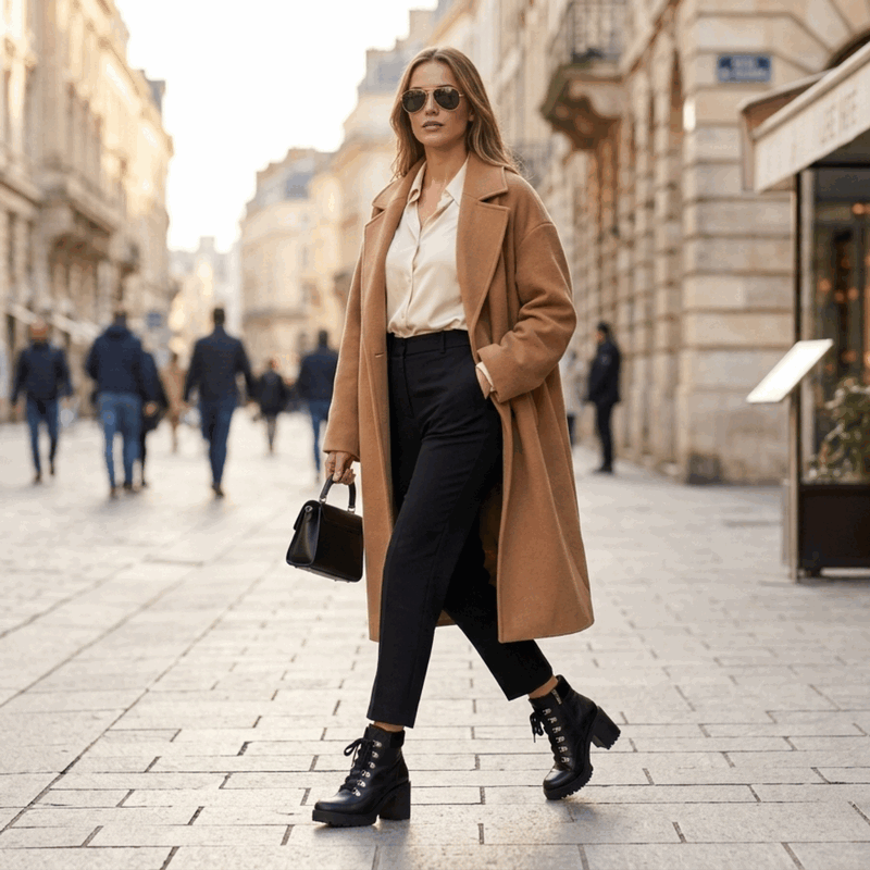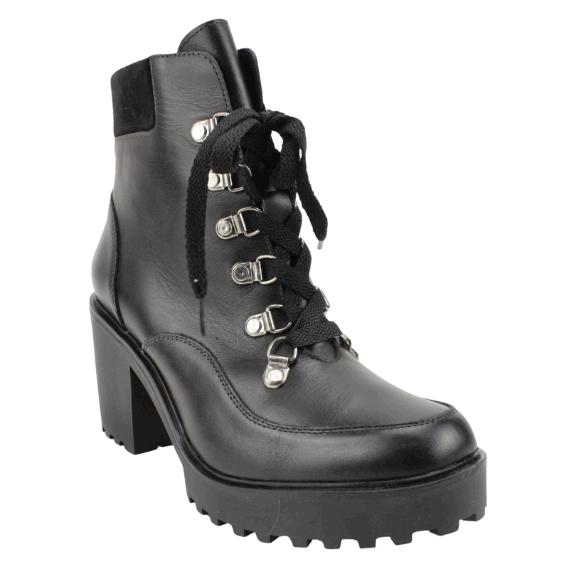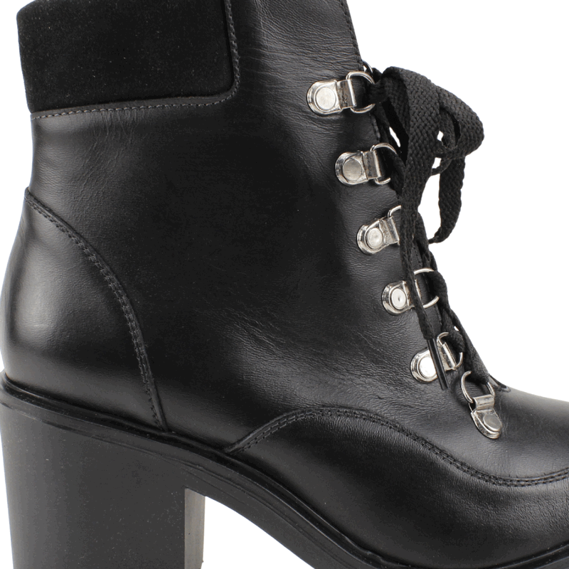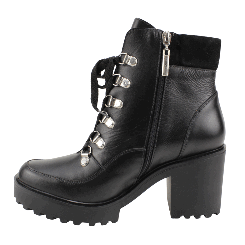 Botín de Mujer Exs de cuero Negro. Fabricado en Colombia. Estilo Militares. Domina las calles con estos botines tipo combat boots de alto impacto. Diseñados en cuero negro de acabado semi-brillante, este modelo destaca por su imponente suela track con plataforma y un taco grueso que te brinda altura sin sacrificar estabilidad. El diseño incluye cordones frontales con ganchos metálicos reforzados, dándole un aire industrial y moderno. Además, cuenta con un panel superior acolchado en textura tipo gamuza para mayor confort en el tobillo y un cierre lateral interno que facilita un calce rápido. Es el calzado ideal para quienes buscan un look con carácter y mucha personalidad. Taco Cuadrado de 8 cm de altura y caña de 11,5 cm de alto.