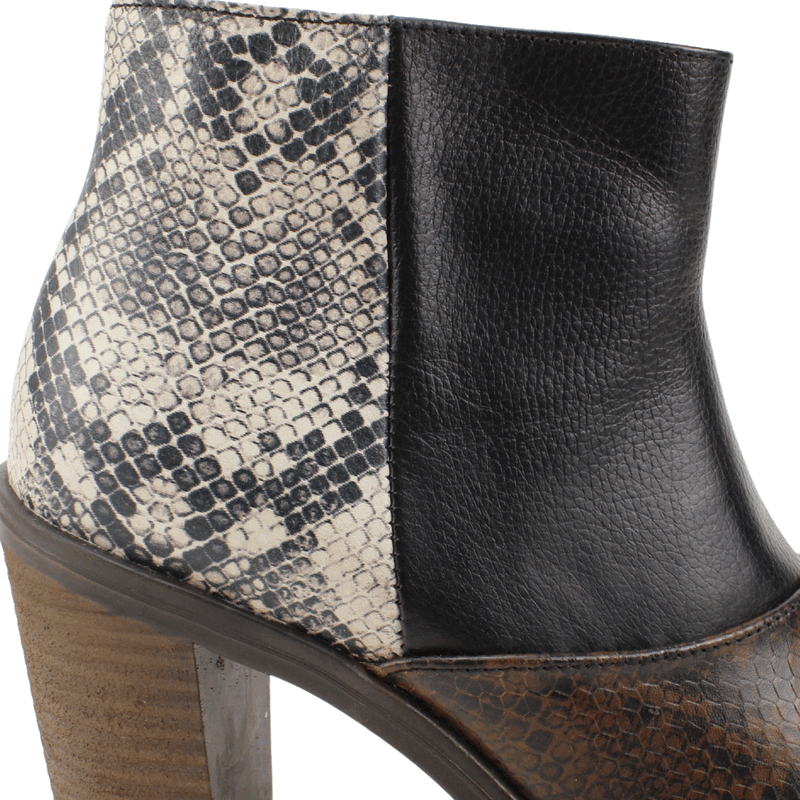 Botín de Mujer Exs de cuero Multicolor. Fabricado en Colombia. Estilo Fiesta. Destaca con un estilo único con estos botines de cuero multitextura, diseñados para quienes no temen ser el centro de atención. Este modelo presenta una sofisticada combinación de tres acabados: una puntera en cuero grabado color café con textura de serpiente, un cuerpo central en cuero liso negro de grano natural, y un talón en animal print de pitón en tonos crema y gris. Su estructura de caña corta ofrece un calce moderno, complementado con un taco alto y robusto con acabado tipo madera que proporciona una elevación elegante y estable. Equipado con un cierre lateral interno para un ajuste perfecto, este botín es el aliado ideal para transformar un outfit básico en uno extraordinario. Taco Cuadrado de 9,5 cm de altura y caña de 9,5 cm de alto.