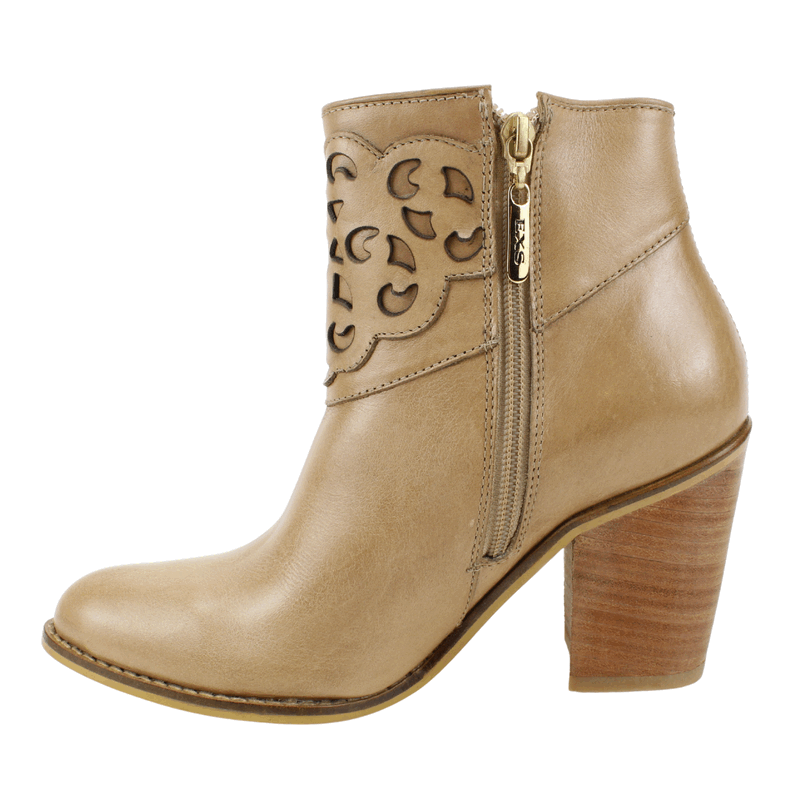 Botín de Mujer Exs de cuero Beige. Fabricado en Colombia. Estilo Casual. Eleva tu estilo con estos sofisticados botines camperos en un versátil tono beige claro. Confeccionados en piel de alta calidad, destacan por su original panel superior con recortes calados geométricos, aportando un toque artesanal y único. Su diseño elegante se complementa con una cremallera lateral dorada con el logo de la marca y un cómodo tacón de madera en bloque de 8,5 cm, ideal para el día a día. Perfectos para combinar con vestidos vaporosos, faldas o jeans para un look boho chic impecable. Taco Cuadrado de 8,5 cm de altura y caña de 9 cm de alto.