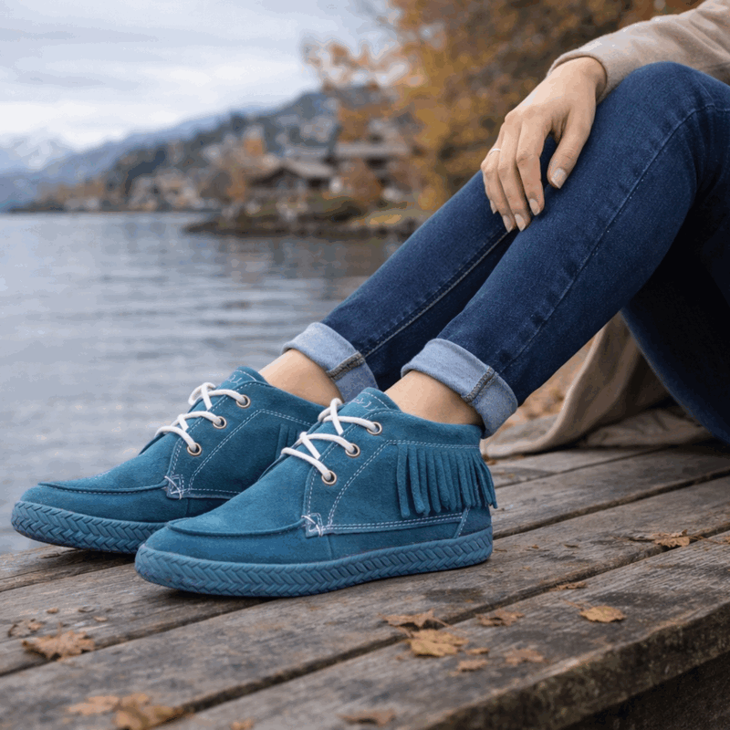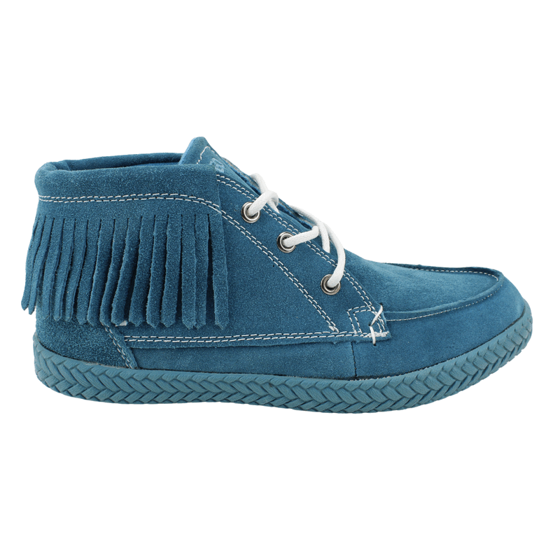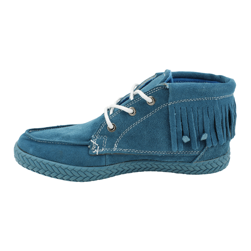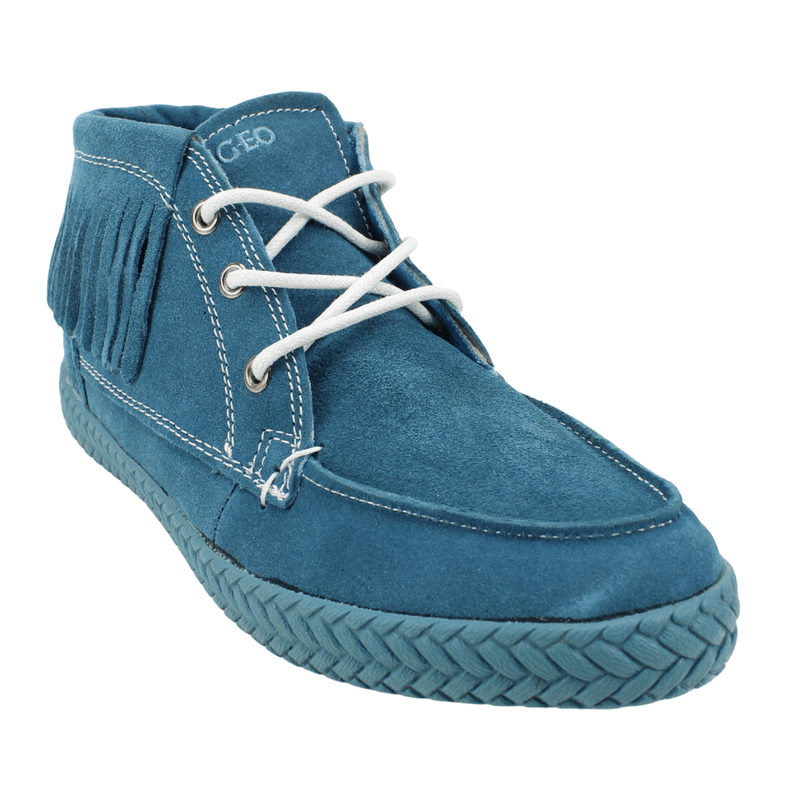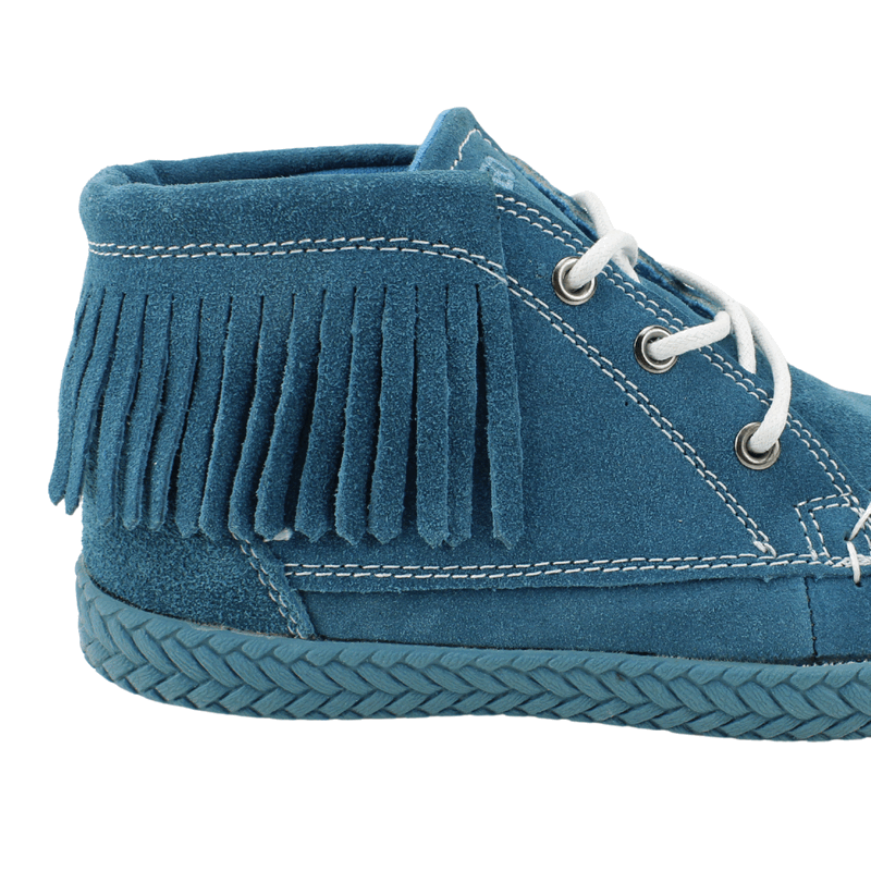 Botín Mujer Nat Geo color turquesa. Estilo casual. Capellada fabricada en reno. Detalle de piezas con flecos en todo el contorno. Sistema de ajuste mediante cordones blancos en contraste. Planta de 2 cm y caña de 8,5 cm de alto.