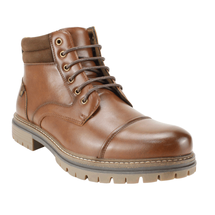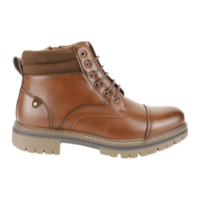 Botines de ecocuero para hombre New Walk color café. Estilo Casual y Militar. Diseño clásico y robusto, perfectos para un look casual y aventurero. La capellada de alta calidad ofrece durabilidad y estilo. Su diseño con cordones y cremallera lateral asegura un ajuste perfecto y fácil colocación. La suela proporciona excelente tracción y resistencia en diferentes superficies. Ideales para el uso diario o para actividades al aire libre. ¡Añade un toque de estilo rústico a tu armario con estos botines!». Taco cuadrado de 3,5 cm de altura y caña de 11,5 cm.