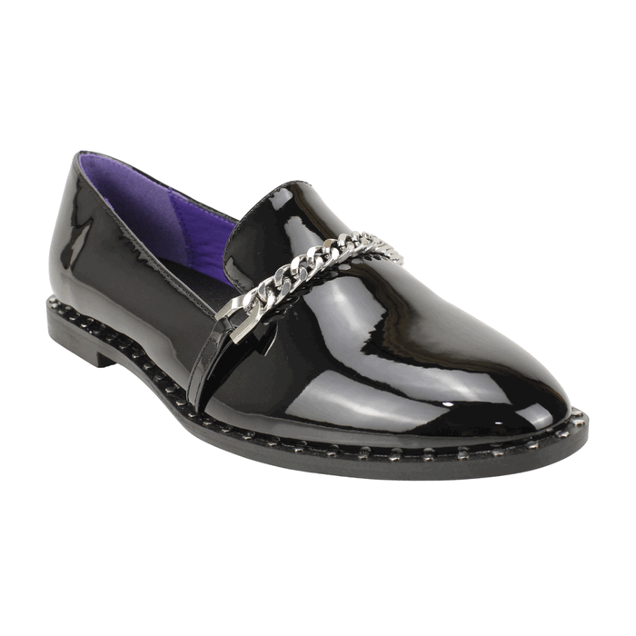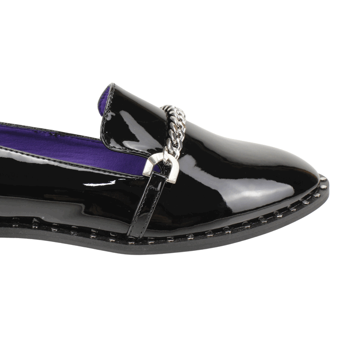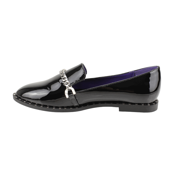 Mocasín de Mujer Agua de Coco color negro. Estilo Casual. Lleva tu calzado plano al siguiente nivel con nuestro Mocasín de Charol Negro de diseño audaz. Este loafer redefine el clásico zapato de vestir combinando el brillo formal del charol con detalles grunge y punk. Son el toque perfecto para añadir carácter a tus looks de oficina, universidad o street style. Ajuste tipo Slip On. Taco cuadrado de 1 cm de alto y caña de 5,5 cm de altura.