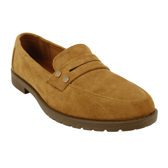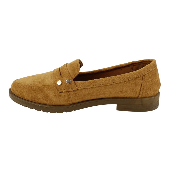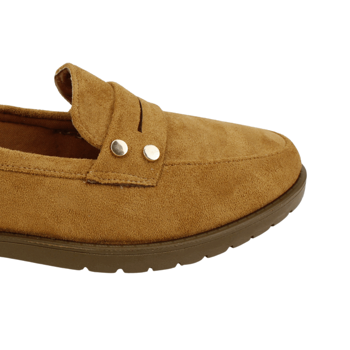 Mocasines de Mujer New Walk color camel. Estilo Casual y Confort. Capellada símil gamuza con tacha decorativa en cinta que cruza el empeine. Plantilla de Confort Gel, la cual es perfecta para el uso diario. Ajuste tipo Slip On. Taco Cuadrado de 2,5 cm de altura y caña de 5,5 cm de alto.