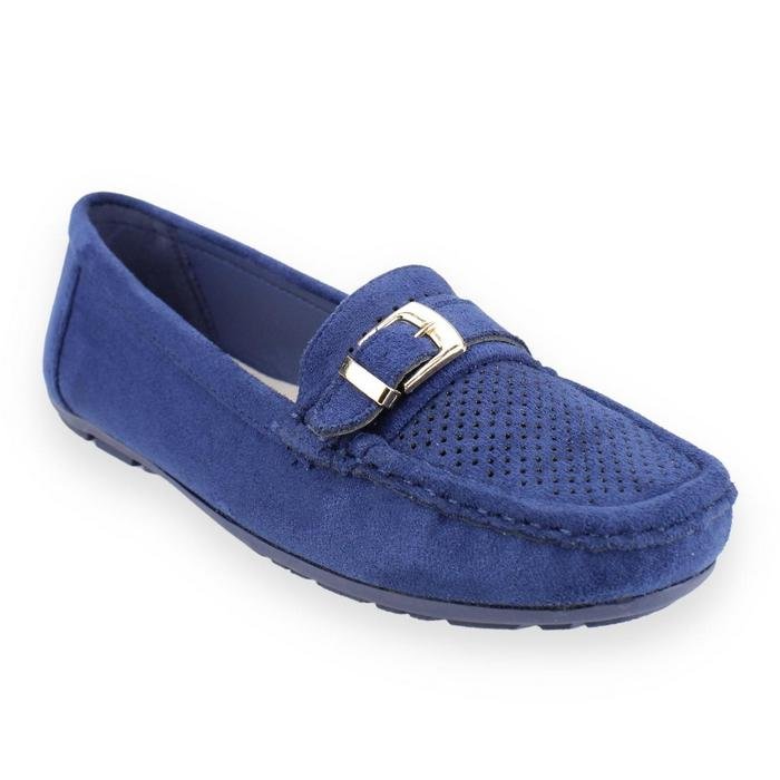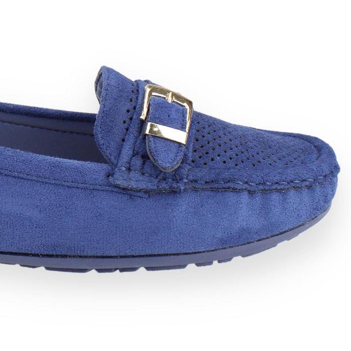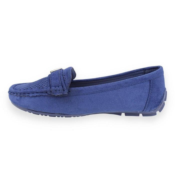 Mocasín de mujer color Azul, estilo casual, capellada símil cuero gamuza con broche decorativo. Plantilla confort perfecta para el día a día. Material Capellada: Poliéster. Material Forro: Cuero y textil. Material Planta: Goma. Caña: 5 cm. Altura Taco: 2 cm