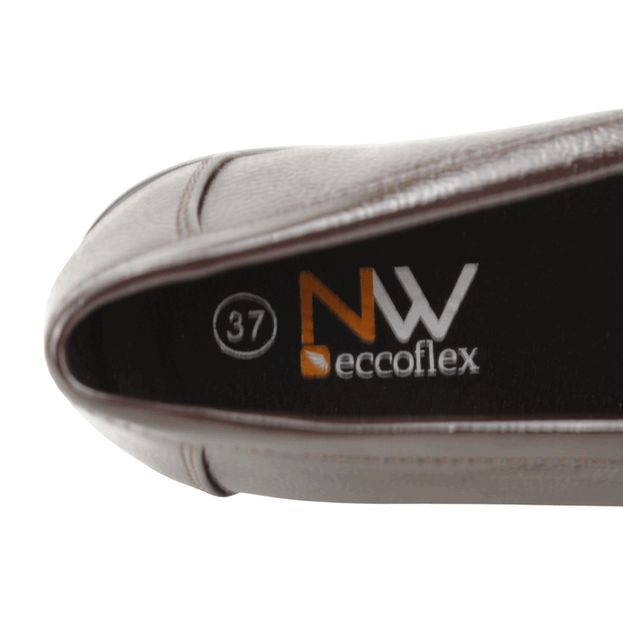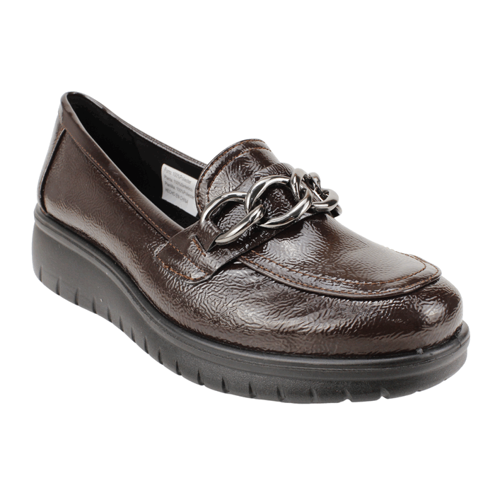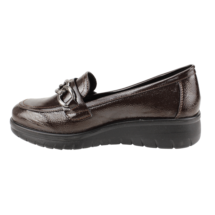 Mocasines de Mujer New Walk color café. Estilo Confort y Casuales. ¡Marca tendencia con un toque sofisticado! Estos modernos mocasines de la línea Eccoflex de New Walk destacan por su acabado en charol brillante y un elegante detalle de cadena metálica en el empeine. Su suela de plataforma ligera no solo añade altura, sino que proporciona una amortiguación excepcional para el uso diario. Ideales para un look preppy o profesional, estos zapatos combinan texturas modernas con la tecnología de confort característica de la marca. Ajuste tipo Slip On. Plataforma de 4 cm de alto y caña de 6,5 cm de altura.
