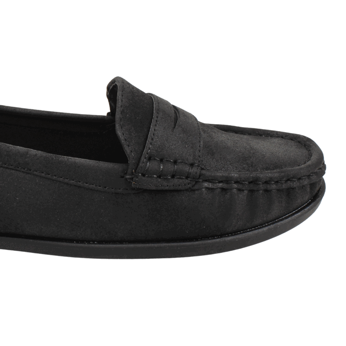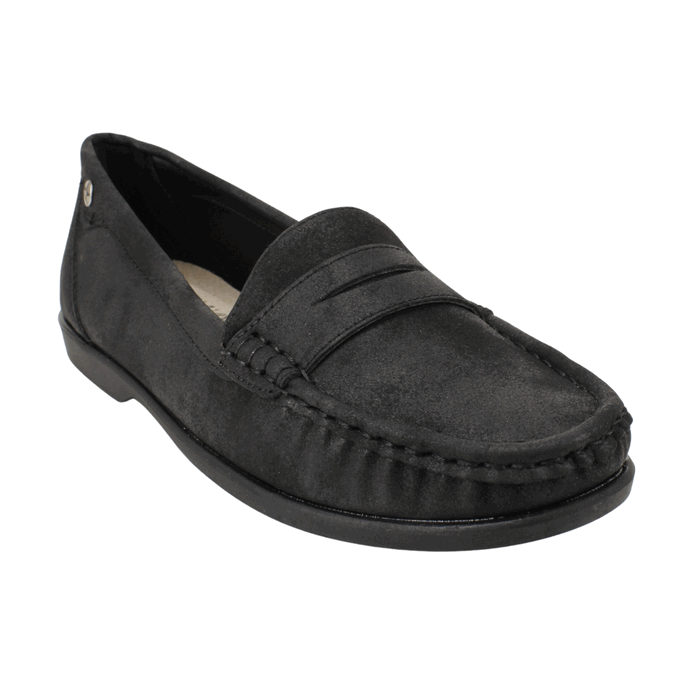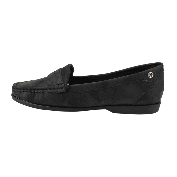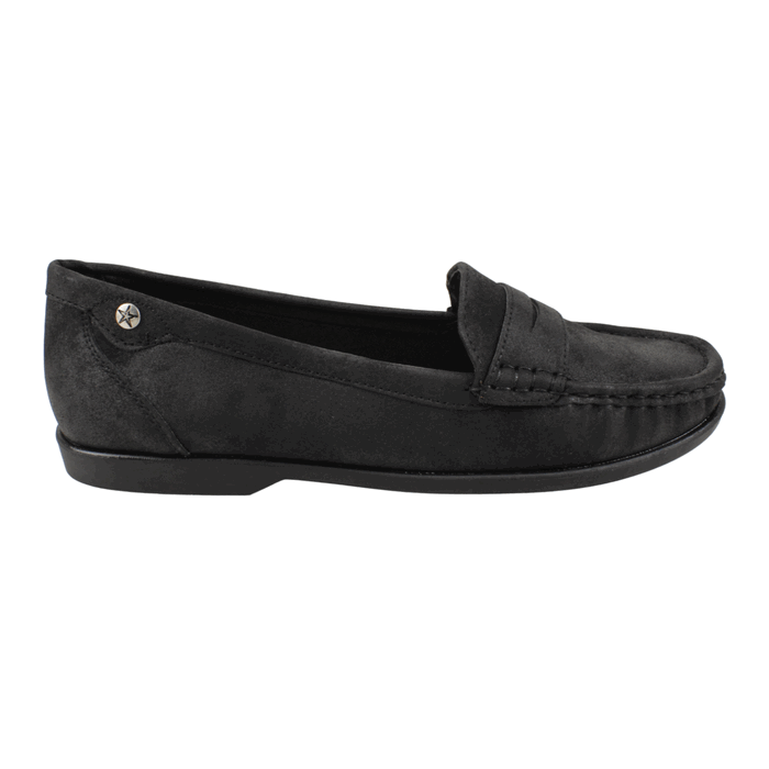 Mocasín de Mujer New Walk color negro. Estilo casual. El clásico que nunca falla. Estos mocasines negros de estilo Loafer son el aliado perfecto para tu día a día. Con un acabado en gamuza sintética de color negro profundo, ofrecen una apariencia sofisticada y profesional. El detalle distintivo es un pequeño broche metálico en forma de estrella en el lateral, que añade un toque de personalidad única. Su diseño minimalista y cómodo los convierte en la opción ideal tanto para la oficina como para una salida casual. Ajuste tipo Slip On. Planta de 1,5 cm de alto y caña de 6 cm de altura.