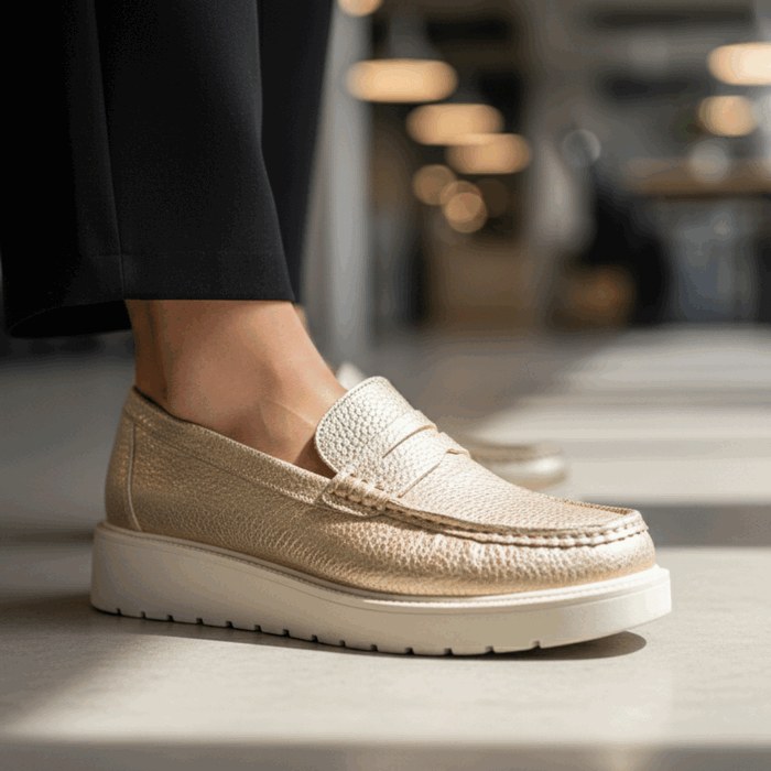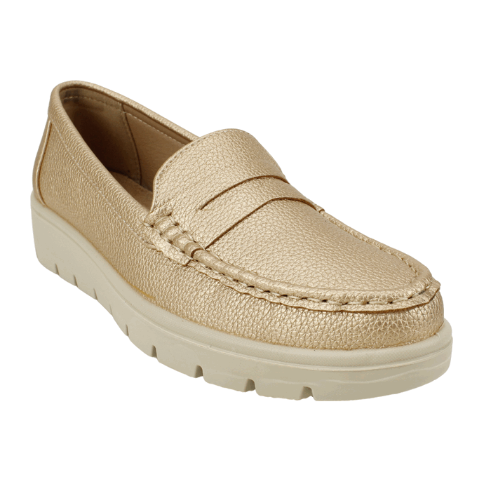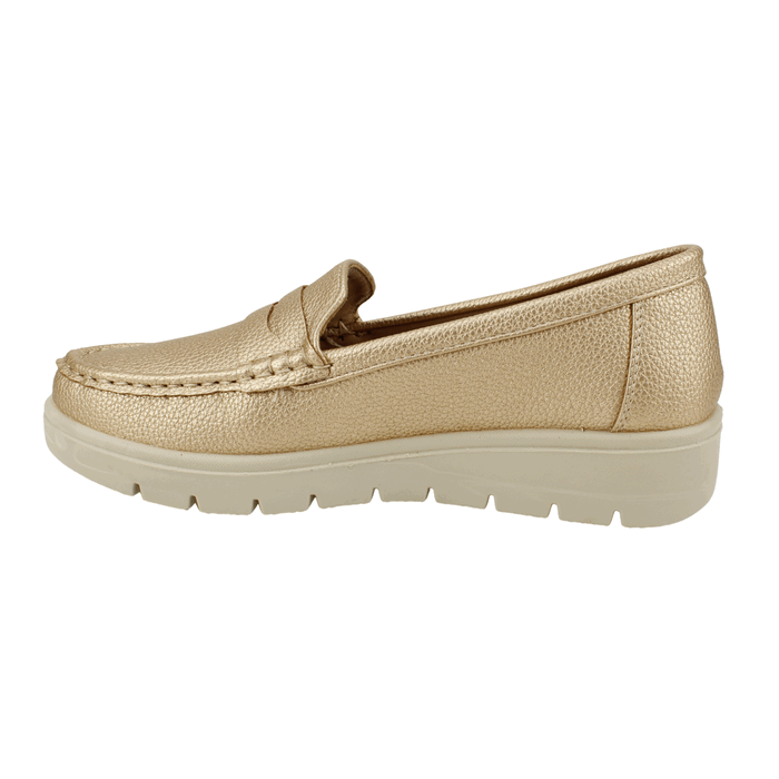 Mocasines de Mujer New Walk color dorado. Estilo Confort y Casuales. ¡El básico indispensable para cualquier armario profesional! Estos mocasines dorados de New Walk Eccoflex ofrecen un estilo sobrio y una comodidad inigualable. Su textura tipo cuero granulado y su suela con amortiguación los hacen ideales para quienes pasan mucho tiempo de pie o caminando. Ajuste tipo Slip On. Plataforma de 3,5 cm de alto y caña de 5,5 cm de altura.