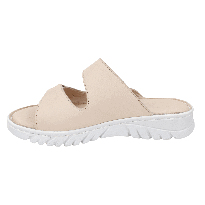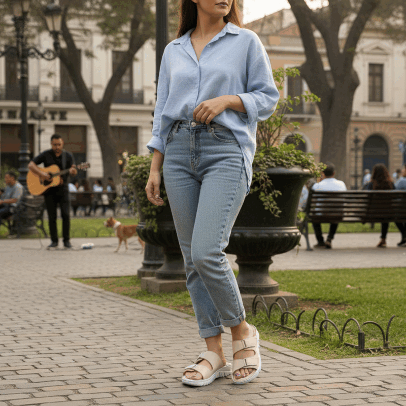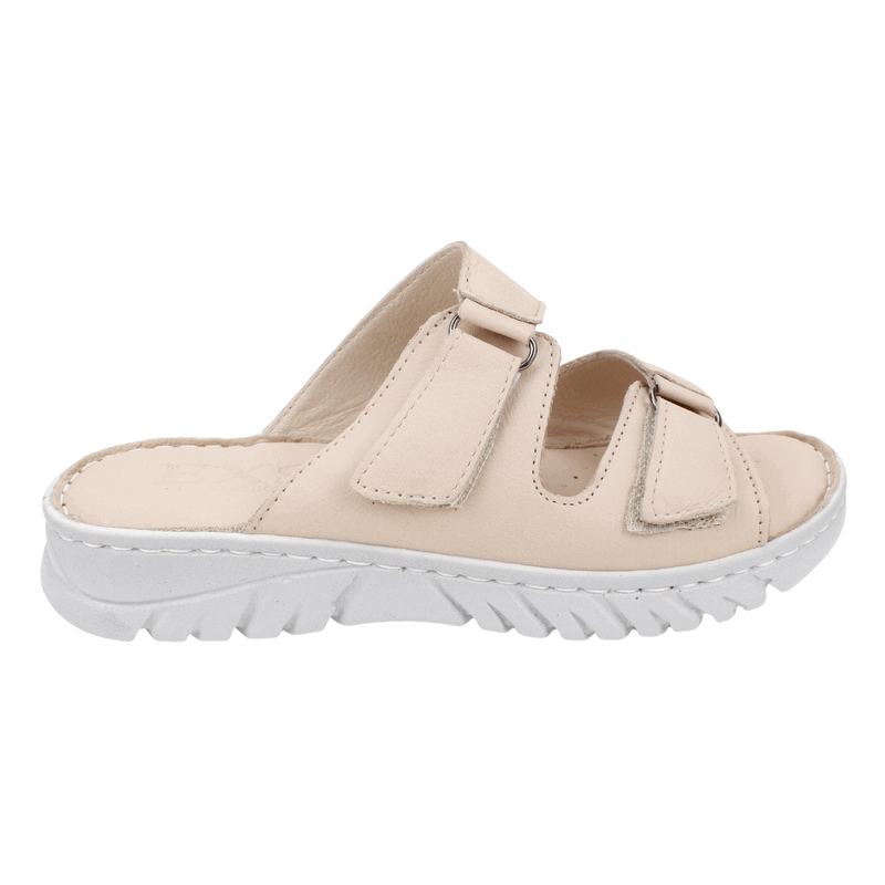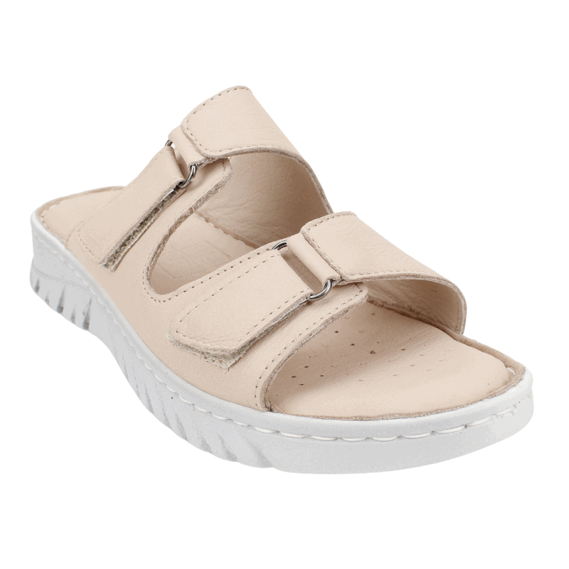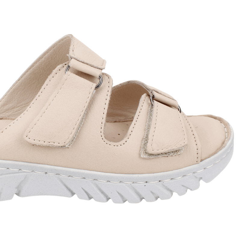 Sandalia de Mujer Exs Cuero color nude de fabricación turca. Estilo Confort. Disfruta de la máxima comodidad en cada paso con nuestras sandalias de diseño ergonómico. Este modelo destaca por su doble correa con cierre de velcro, que permite un ajuste perfecto y seguro según el empeine de cada persona. Su planta blanca con relieve antideslizante ofrece una amortiguación superior, ideal para largas caminatas o para quienes buscan un descanso real durante el día. Ajuste mediante velcro. Plataforma de 3 cm de altura.