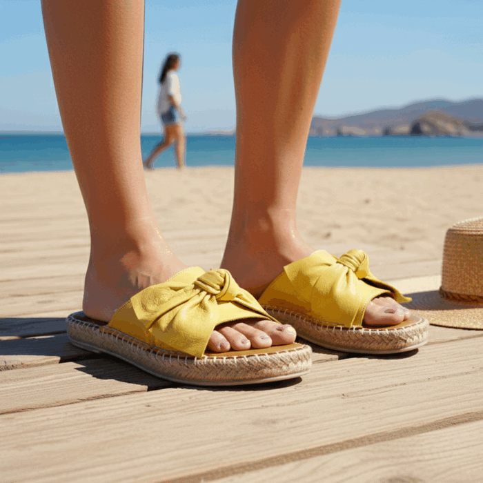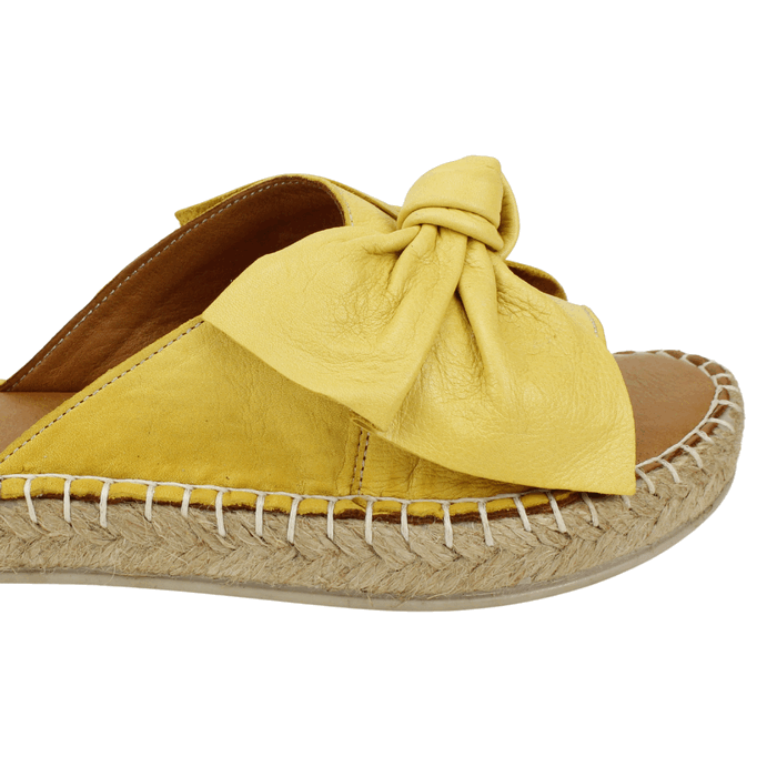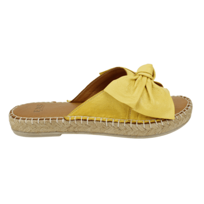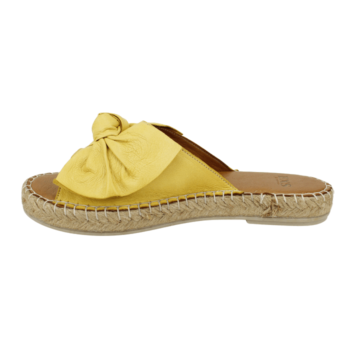 Sandalia de Mujer Exs cuero amarilla, fabricada en Turquía. Estilo Casual. Capellada de cuero con diseño de lazo en cinta única a la altura del empeine. Ajuste tipo Slip On. Plataforma de 2,5 cm de altura.