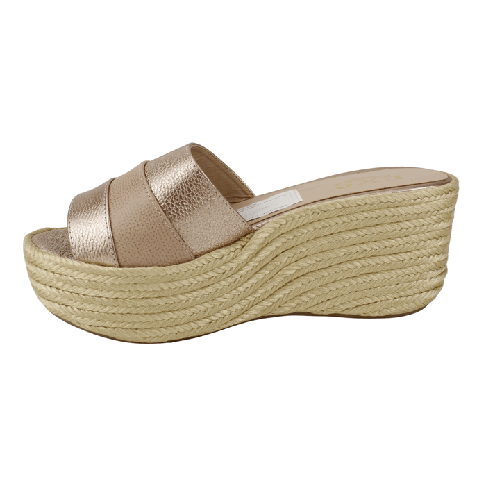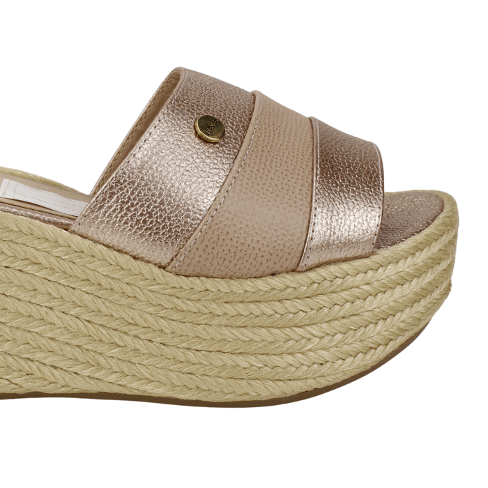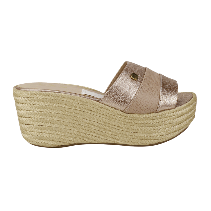 Sandalia Mujer Exs Cuero color Nude. Estilo Casual. Eleva tu estilo con estas deslumbrantes sandalias plataforma ideales para la temporada primavera-verano. Su diseño moderno combina una cuña alta de yute trenzado con una capellada de cuero en un sofisticado color oro rosa o nude metálico. Son el calzado perfecto para lucir a la moda sin sacrificar la comodidad. Úsalas para un look casual chic de día o para darle un toque glam a tus outfits de noche. La suela tipo espadrille te proporciona la altura ideal y una pisada estable. ¡Añade este imperdible de tendencia a tu colección! Ajuste tipo Slip On. Plataforma de 7 cm de altura.