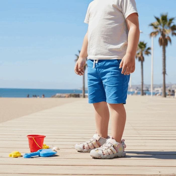 Sandalia de Niñas Nat Geo Kids de color gris. Estilo Outdoor y Trekking. Capellada en símil cuero y otras en textil y mesh, con múltiples sistemas de amarre y cintas con diseño de camuflaje en tono rosado y blanco. Ajuste mediante velcro a la altura del tobillo y talón. Planta de 1,5 cm de alto y caña de 7 cm de altura.