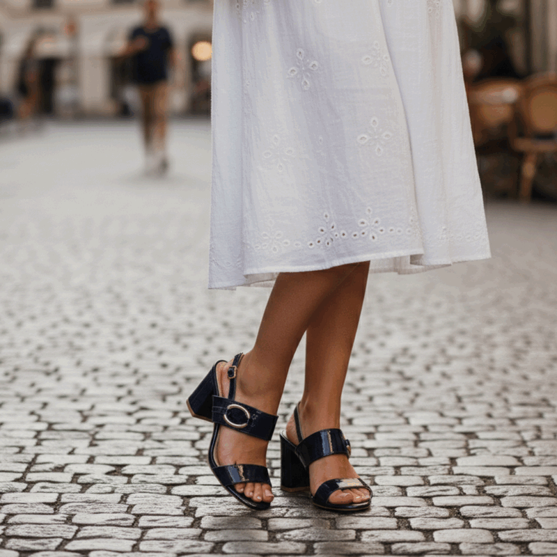 Sandalia Mujer New Walk casual color negro. Estilo Fiesta. Capellada abierta con detalle de argolla en empeine. Sistema de ajuste mediante hebilla en el tobillo. Taco cuadrado de 7,5 cm de alto. Horma normal.