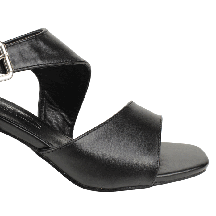Sandalia de Mujer New walk color negro. Estilo Fiesta. Presentamos la sandalia ideal que equilibra la elegancia atemporal con el confort diario. Esta Sandalia de Tacón Grueso Negra es el complemento perfecto para tu vestuario de oficina o para cualquier evento que requiera estar de pie por largo tiempo. El diseño presenta una tira ancha en la punta abierta y un sofisticado diseño de tiras cruzadas y cortadas en la parte superior del pie, que aseguran un ajuste seguro y favorecedor. El material es un acabado negro mate de símil cuero, lo que le da un look pulido y profesional. El tacón cuadrado es la clave de su comodidad, proporcionando una base estable para caminar y reduciendo la tensión en el pie. La pulsera ajustable al tobillo con una hebilla metálica asegura un soporte óptimo. Es un básico esencial que combina con todo, desde faldas midi hasta pantalones de vestir. Taco Cuadrado de 7,5 cm de altura.