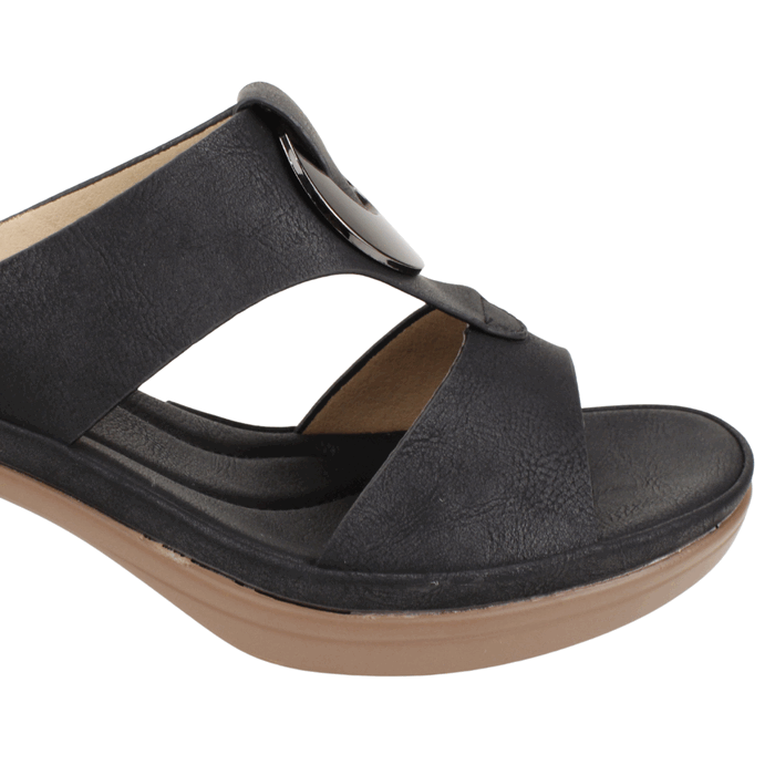 Sandalia de Mujer New walk color negro. Estilo Fiesta. La Sandalia Mule de Tacón de Bloque en color negro es la elección ideal para quienes buscan elegancia y comodidad al instante. Su diseño tipo mule permite calzarla fácilmente, mientras que el tacón grueso te brinda estabilidad. Esta sandalia presenta una capellada de doble tira que sujeta el empeine. En la parte superior, destaca un adorno metálico grande y pulido en tono oscuro, que le confiere un aire moderno y sofisticado. El tacón de bloque es de altura media, con un acabado de textura de madera rayada en color café claro, creando un atractivo contraste bicolor con la sandalia negra. Su suela delantera, también gruesa, asegura un soporte adicional. Es perfecta para looks de oficina, eventos sociales o cualquier ocasión donde se requiera un toque de distinción y confort al caminar. Ajuste tipo Slip On. Taco Cuadrado de 6 cm de altura.