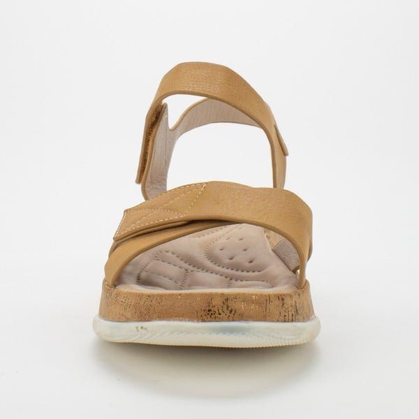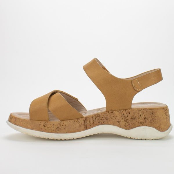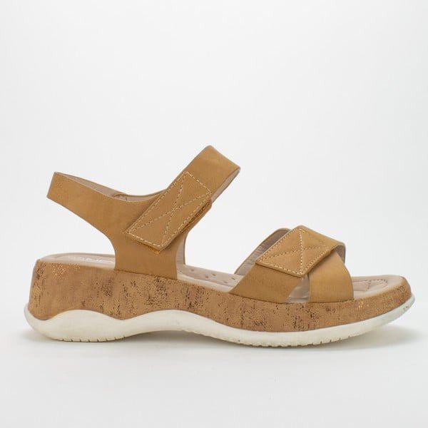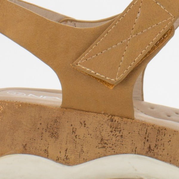 Sandalia New Walk casual color Camel. Capellada eco cuero efecto desgastado. Sistema de ajuste mediante velcro. Planta de 4cms de alto de máxima comodidad.