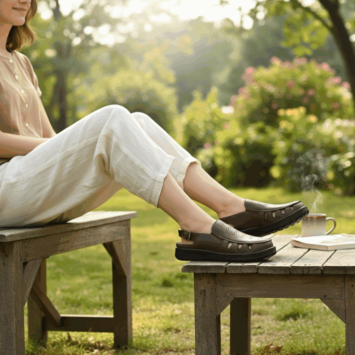 Sandalia de Mujer New Walk color café. Estilo Confort. Combina el estilo clásico de un mocasín con la frescura de una sandalia gracias a nuestra sandalia abierta. Confeccionada en símil cuero color café de alta calidad, este calzado es la solución perfecta para quienes buscan soporte y comodidad durante todo el día. El diseño presenta una puntera semicerrada con un panel de micro-perforaciones para una ventilación superior, ideal para climas cálidos. La parte del talón es abierta y se ajusta con una correa de hebilla para mayor seguridad. La suela gruesa y antideslizante con tecnología ortopédica Eccoflex proporciona una amortiguación excepcional, absorbiendo el impacto en cada paso. Un calzado funcional, elegante y cómodo para el uso diario. Ajuste mediante correa con broche a la altura del tobillo. Plataforma de 3 cm de altura.