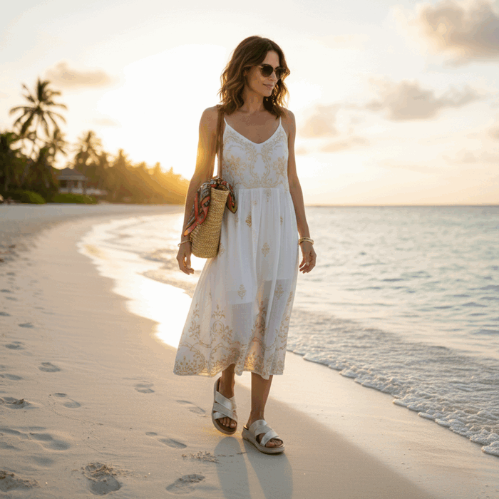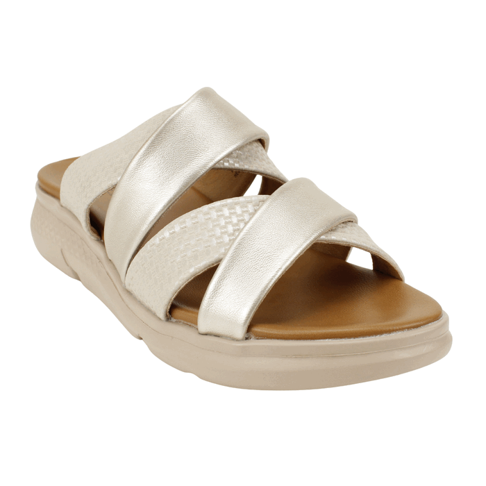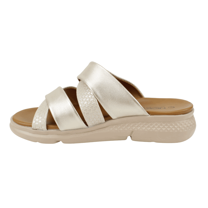 Sandalia de Mujer New walk color dorado. Estilo Casual. Adopta la tendencia athleisure con estas Sandalias Slide dorado con Suela Deportiva. Este diseño fusiona la comodidad de un calzado deportivo con el estilo relajado de una sandalia de verano. El modelo presenta tiras cruzadas en la capellada con un atractivo contraste de texturas: una tira es de material liso y la otra luce un tejido o trenzado en relieve de patrón canasta, ambos en color dorado. Este detalle texturizado le da un toque sofisticado y moderno. La suela es el elemento clave, una plataforma gruesa de estilo deportivo en un tono crema claro. Esta suela ofrece una tracción excelente y una amortiguación superior, haciendo que sean perfectas para caminar largas distancias o para usarlas todo el día. Ideales para looks casuales, urbanos y cómodos. Ajuste tipo Slip On. Plataforma de 4 cm de altura.