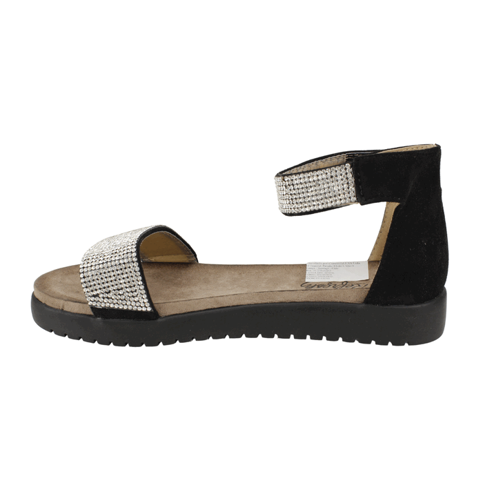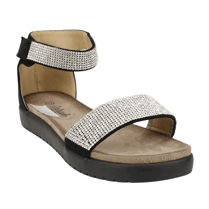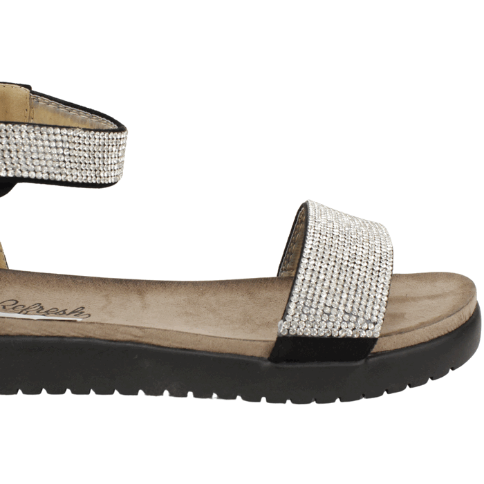 Sandalia de Mujer Refresh color negra. Estilo Casual. ¡Dale un toque de glamour a tu estilo sin renunciar a la comodidad! Estas sandalias planas negras con strass son el calzado perfecto para esta temporada. El diseño presenta dos tiras anchas completamente cubiertas de brillantes que capturan la luz a cada paso, transformando un look casual en uno elegante y moderno. Su color negro profundo las hace versátiles y fáciles de combinar con cualquier prenda, desde jeans hasta vestidos de verano. Cuentan con una plataforma baja y cómoda que garantiza una pisada suave y estable durante todo el día. El ajuste al tobillo con velcro asegura un soporte ideal. Plataforma de 2,5 cm de altura y caña de 8,5 cm de alto.