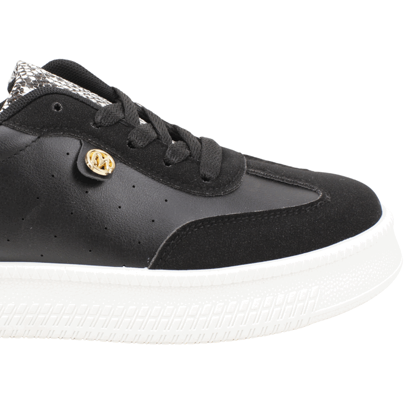 Zapatillas de Mujer Agua de Coco color negro. Estilo Urbano Estas zapatillas urbanas de mujer combinan elegancia y modernidad con una base de piel sintética negra y sofisticados refuerzos de gamuza al tono en la punta y el talón. El diseño resalta por sus detalles en animal print de serpiente en la lengüeta y el talón, complementados con un pin metálico dorado lateral que aporta un toque de lujo. Su plataforma blanca de alto impacto ofrece un contraste visual atractivo y una amortiguación superior para el uso diario, mientras que los laterales microperforados favorecen la transpirabilidad. Es el calzado versátil ideal para quienes buscan comodidad sin perder el estilo chic urbano. Ajuste mediante cordones planos a tono. Plataforma de 3,5 cm de altura y caña de 7 cm alto.