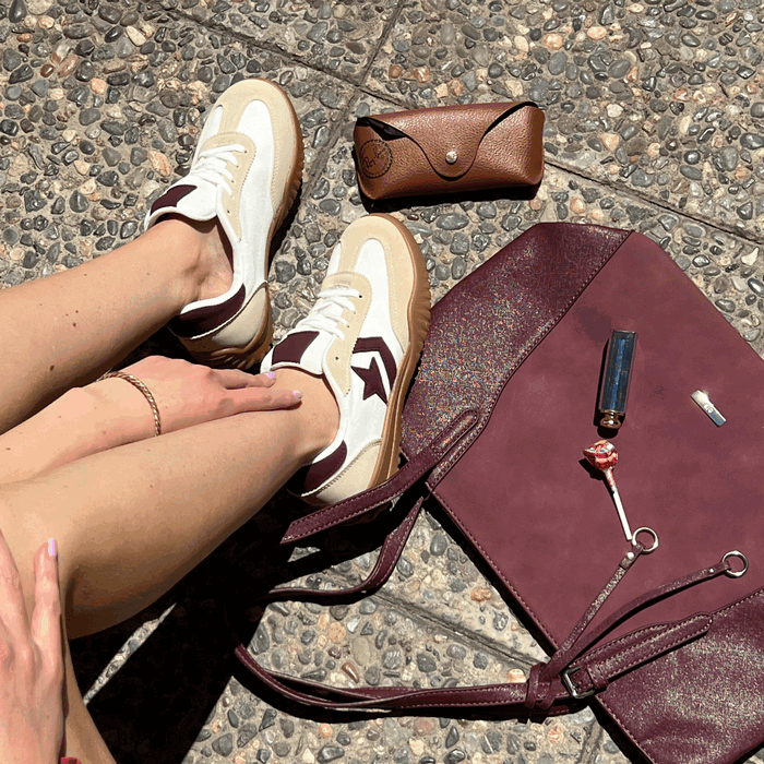 Zapatilla Mujer Agua de Coco color Crema y estrella en color burdeo. Estilo Urbano. Recupera el estilo con estas zapatillas de inspiración retro. Este modelo combina una base de lona blanca con refuerzos en gamuza beige y el icónico logo de estrella en negro. Es la fusión perfecta entre la moda deportiva vintage y el confort moderno. La característica más llamativa es su suela de goma color caramelo con agarre, pero que hoy ofrece un look urbano y atemporal. Ideales para un outfit casual o para las amantes del estilo sneaker retro. Ajuste mediante cordones planos. Plataforma de 2,5 cm de altura y caña de 6,5 cm.