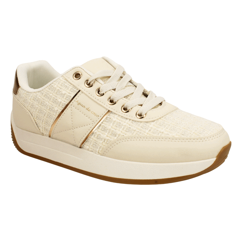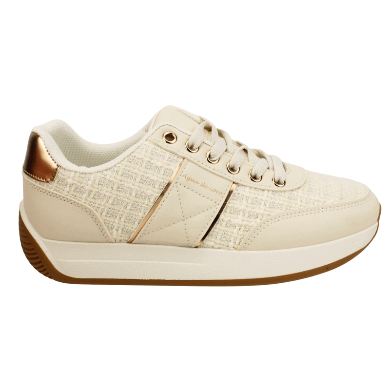 Zapatillas de Mujer Agua de Coco color Dorado. Estilo Urbano. Dale un toque chic y moderno a tus outfits con estas zapatillas urbanas de plataforma para mujer. Destacan por su panel lateral en material textil texturizado que contrasta elegantemente con los detalles en piel sintética lisa y los acentos brillantes en el talón y el pasador de los cordones, donde se aprecia sutilmente la marca «Agua de coco». Su diseño de suela de plataforma blanca con base camel ofrece altura y comodidad durante todo el día, ideal para combinar con looks casuales o más arreglados. Ajuste mediante cordones planos a tono. Plataforma de 3 cm de altura y caña de 5 cm alto.
