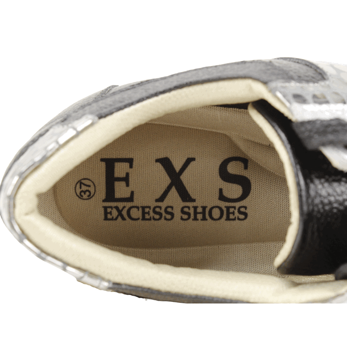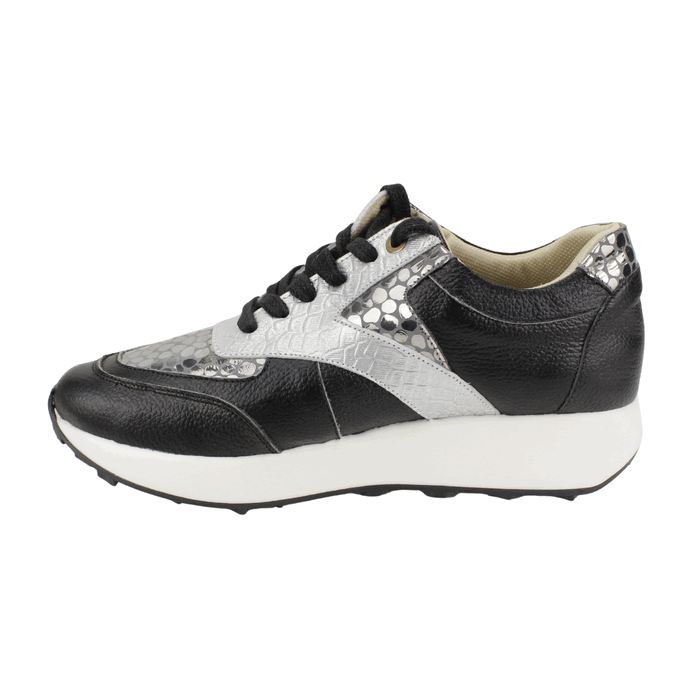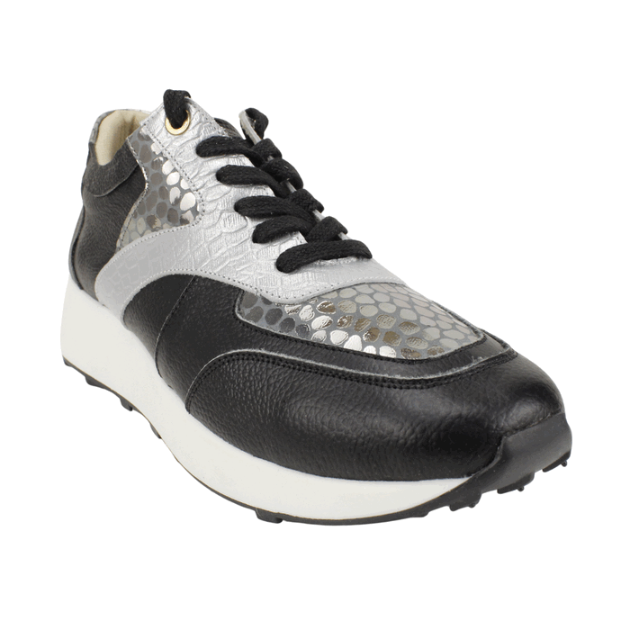 Zapatillas de Mujer Exs de cuero color negro, de fabricación colombiana. Estilo Urbano y Confort. Descubre el estilo y la comodidad con las zapatillas urbanas. Diseñadas para la mujer moderna, estas zapatillas combinan a la perfección la elegancia del cuero negro de alta calidad con audaces detalles plateados con textura de serpiente. Su diseño contemporáneo y la suela de plataforma blanca brindan un look vanguardista, ideal para cualquier ocasión, desde un paseo casual hasta una salida con amigas. El interior, suave y acolchado, asegura una comodidad excepcional durante todo el día. Cuentan con un cierre de cordones negros para un ajuste perfecto y detalles metálicos dorados que añaden un toque de sofisticación. Plataforma de 3 cm de alto y caña de 7,5 cm de altura.