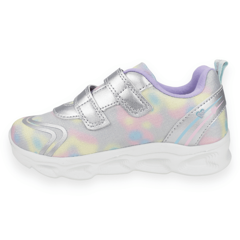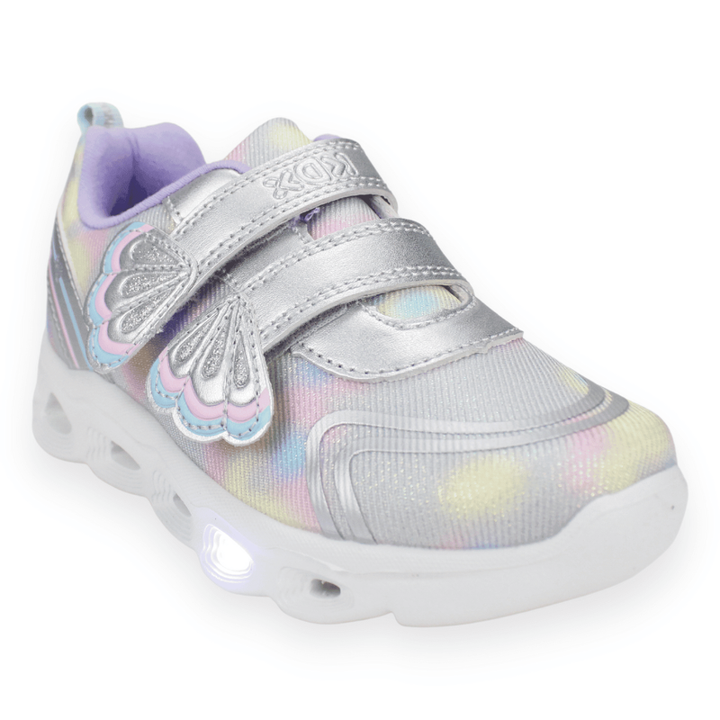 Zapatilla Niña KDX color plateado. Estilo urbano. Capellada con detalles en color tornasol con sistema de luces que se encienden al caminar pasando desde el rosado al blanco y al azul. Ajuste mediante velcro con detalle de alas de mariposa. Planta de 3 cm de altura y caña media de 5 cm de alto. Material capellada: Poliuretano. Material forro: Poliuretano. Material planta: Goma. Tabla de medidas: 24 mide 15 cm, 25 mide 15,5 cm, 26 mide 16 cm, 27 mide 16,5 cm, 28 mide 17 cm, 29 mide 17,5 cm.