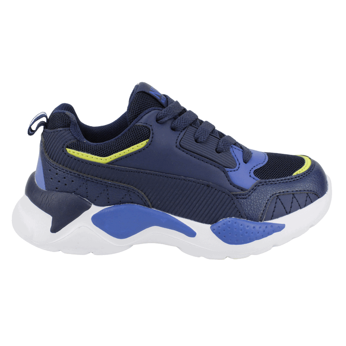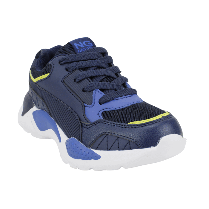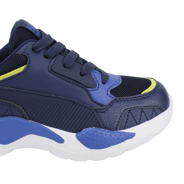 Zapatillas de Niños Nat Geo Kids color Azul. Estilo Urbano. Estas modernas zapatillas deportivas para niño son el calzado ideal para acompañar todas sus aventuras con estilo y confort. Su diseño combina tonos de azul marino y azul royal con un toque de amarillo neón, creando una apariencia vibrante y llena de energía. Confeccionadas con una mezcla de materiales que incluyen malla transpirable y capas sintéticas, ofrecen durabilidad y frescura. La suela gruesa y robusta, al estilo «chunky», no solo está a la moda, sino que también proporciona una excelente amortiguación y soporte para que los niños puedan correr y jugar cómodamente. El cierre de cordones asegura un ajuste firme y seguro para cualquier actividad. Ajuste mediante cordones planos a tono. Planta de 3 cm de alto y caña de 5,5 cm de altura.
