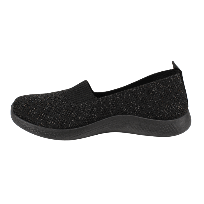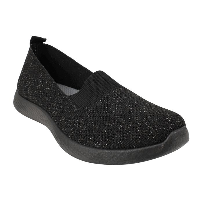 Zapatilla de Mujer New Walk color negro. Estilo Casuales. La combinación perfecta entre ligereza y elegancia sutil. Estas zapatillas tipo slip-on están confeccionados en un tejido de punto flexible que se adapta a tu pie como un guante. El acabado azul marino cuenta con delicados destellos metálicos que añaden un toque especial a tu calzado de descanso o ejercicio ligero. Gracias a la tecnología de su plantilla Eccoflex, disfrutarás de una amortiguación superior que cuida tus pies durante largas jornadas. Ajuste tipo Slip On. Plataforma de 2,5 cm de alto y caña de 5 cm de altura.