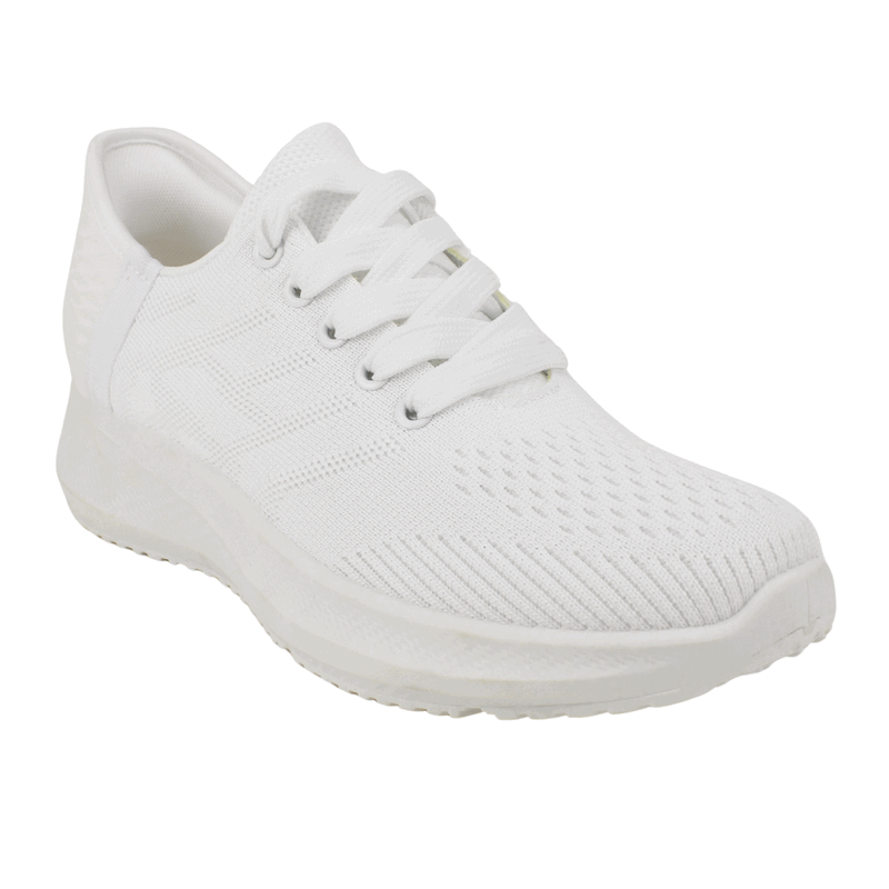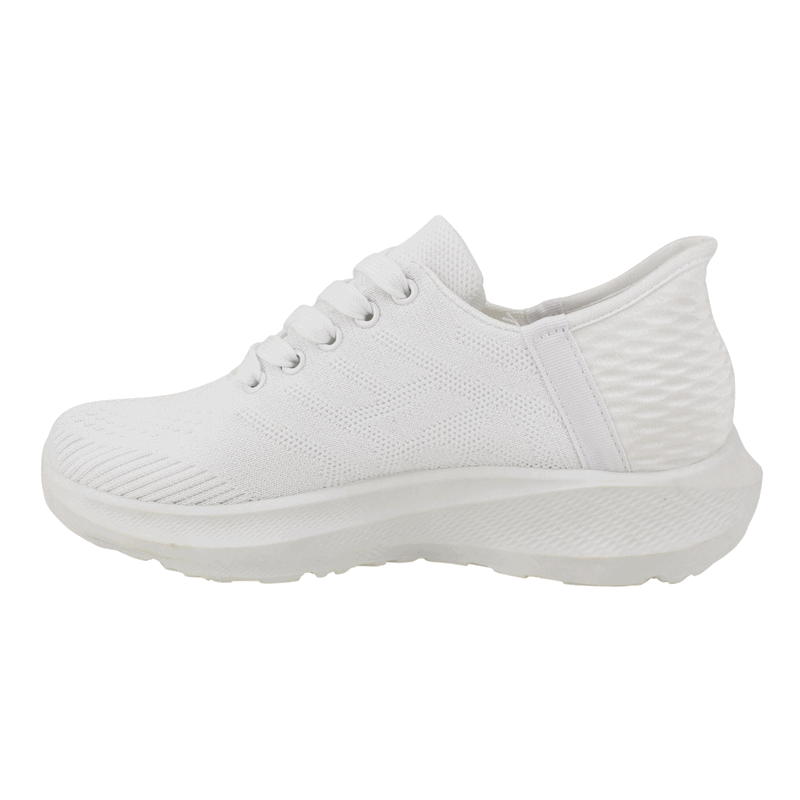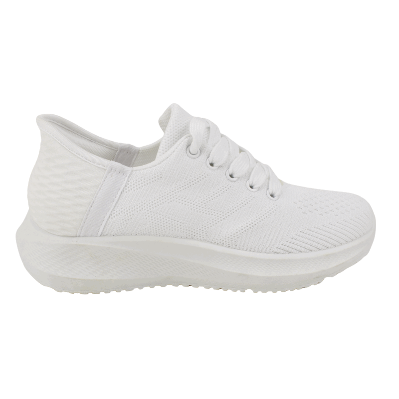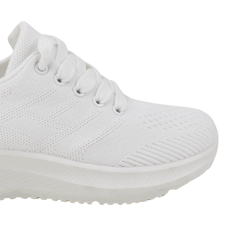 Zapatilla de Mujer New Walk color blanco. Estilo Deportiva. Para quienes creen que «menos es más», esta zapatilla es el básico indispensable. Su diseño monocromático en blanco puro resalta gracias a las texturas geométricas en el talón y el tejido técnico del empeine. Es la zapatilla ideal para combinar con cualquier outfit, desde unos jeans hasta un vestido informal, ofreciendo una silueta limpia y sofisticada. Ajuste mediante cordones planos. Plataforma de 4 cm de alto y caña de 6,5 cm de altura.