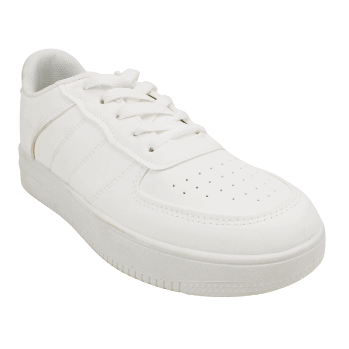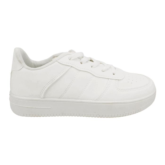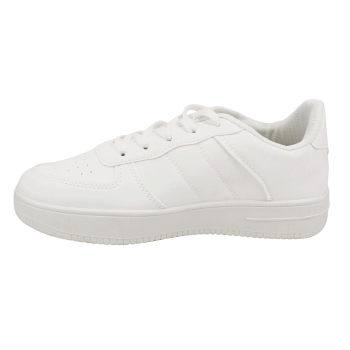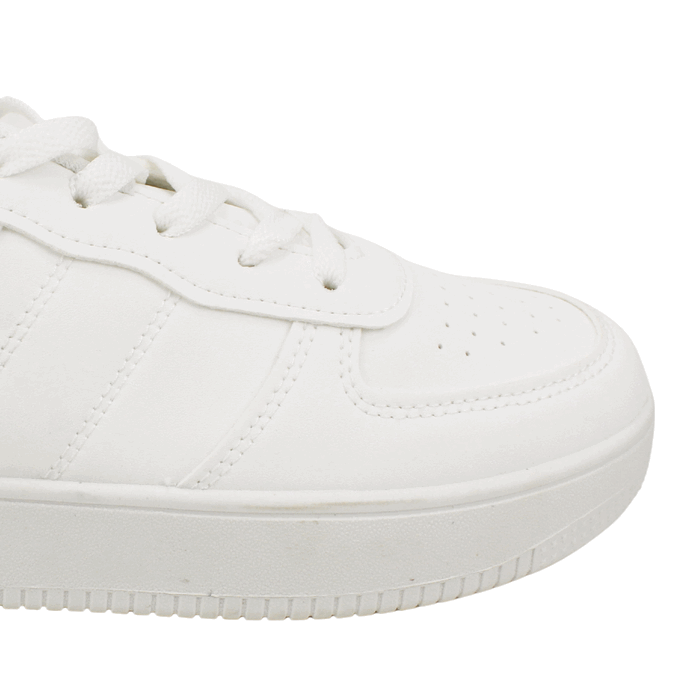 Zapatilla Unisex New Walk color blanco. Estilo Escolar. ¡Prepárate para la vuelta a clases con el calzado perfecto! Estas zapatillas blancas combinan durabilidad y un diseño clásico que se adapta a cualquier uniforme escolar. Fabricadas con material sintético de alta calidad y fácil limpieza, son ideales para el ajetreo diario del colegio y las clases de gimnasia. Ajuste mediante cordones a tono. Plataforma de 3 cm y caña de 7 cm.