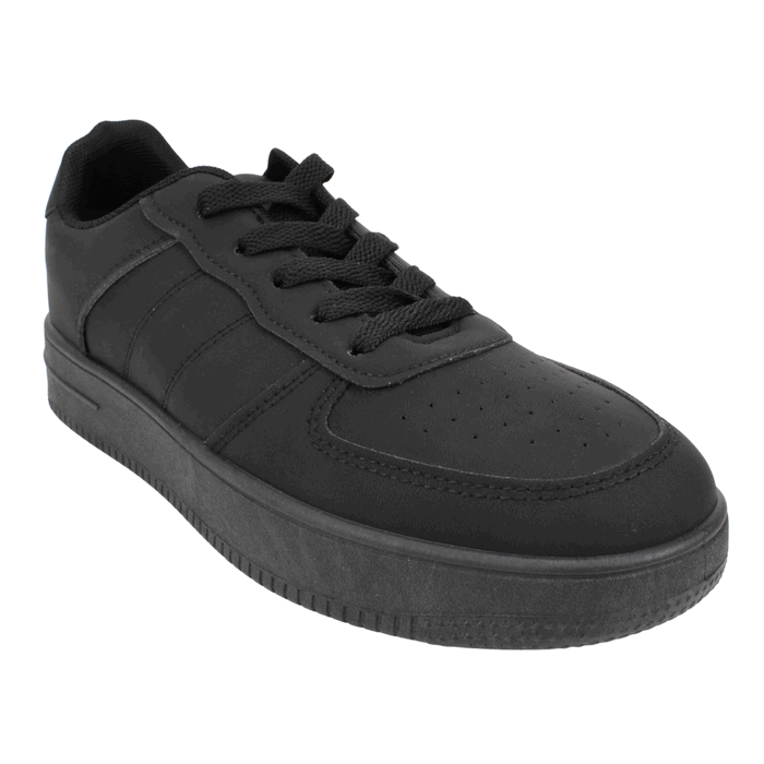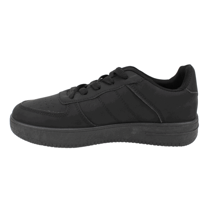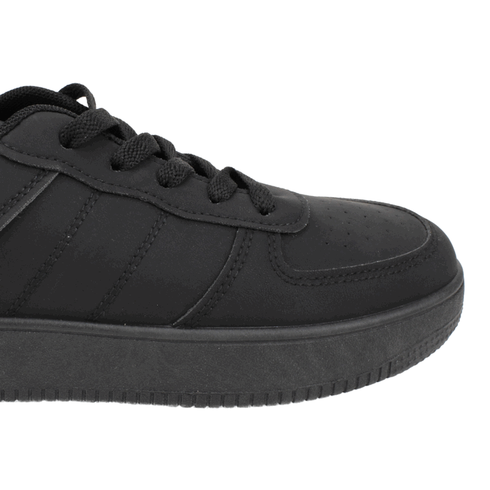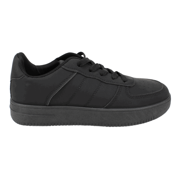 Zapatilla Unisex New Walk color negro. Estilo Escolar. ¡Prepárate para la vuelta a clases con el calzado perfecto! Estas zapatillas negras combinan durabilidad y un diseño clásico que se adapta a cualquier uniforme escolar. Fabricadas con material sintético de alta calidad y fácil limpieza, son ideales para el ajetreo diario del colegio y las clases de gimnasia. Ajuste mediante cordones a tono. Plataforma de 3 cm y caña de 7 cm.
