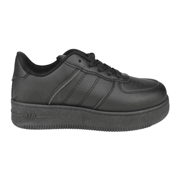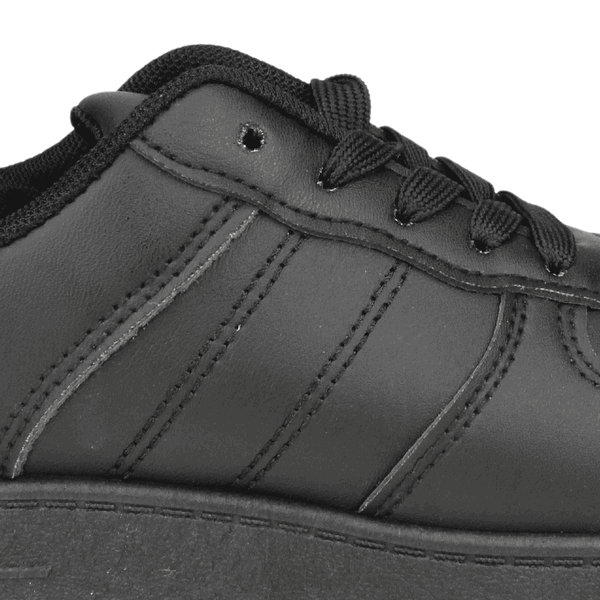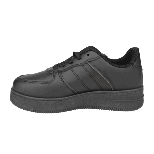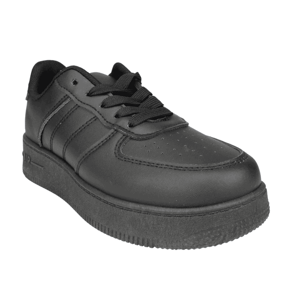 Zapatilla Unisex New Walk color negro. Estilo Urbano y Escolar. Diseño de capellada en símil cuero texturizado con detalles de costuras dobles y punta perforada. Ajuste mediante cordones planos a tono. Planta de 3,5 cm de alto y caña de 5,5 cm de altura.