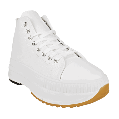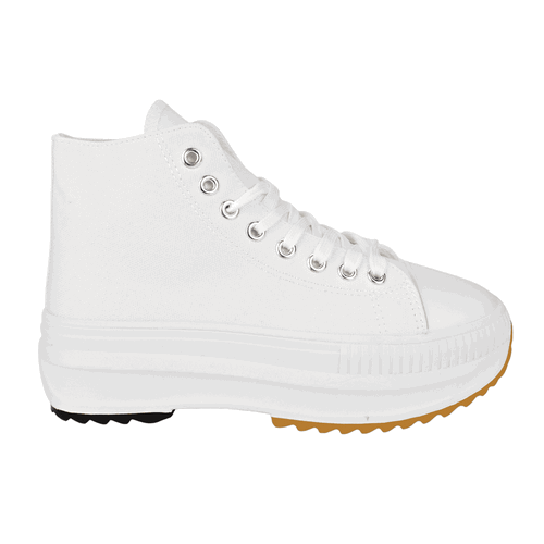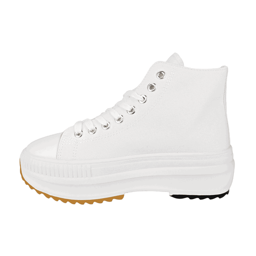 Zapatilla de Mujer New Walk color Blanco. Estilo urbano. Capellada lona con detalles de plata con dos tonos en su base y punta de goma para mayor durabilidad. Sistema de cierre mediante cordones planos en tono blanco con ojales metálicos. Plataforma de 4,5 cm de altura y caña de 9 cm de alto.