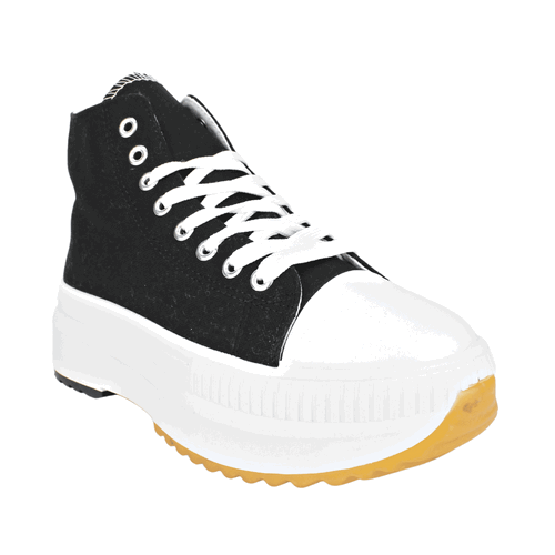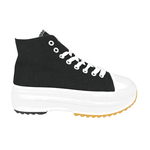 Zapatilla de Mujer New Walk color Negro. Estilo urbano. Capellada lona con detalles de planta con dos tonos en su base y punta de goma para mayor durabilidad. Sistema de cierre mediante cordones planos en tono blanco con ojales metálicos. Plataforma de 4,5 cm de altura y caña de 9 cm de alto.