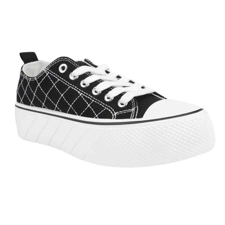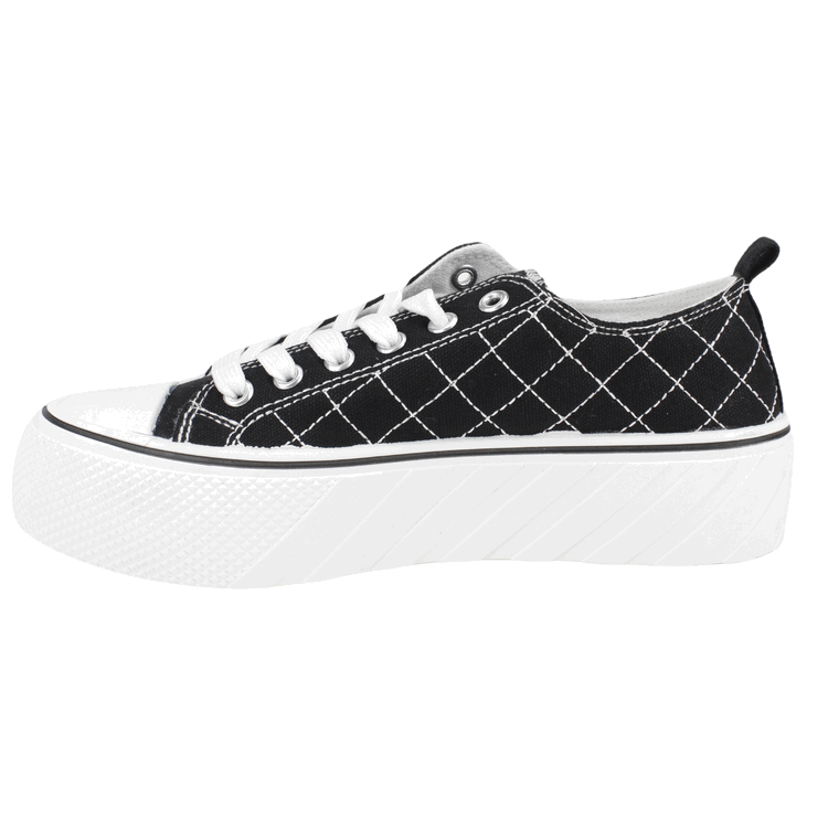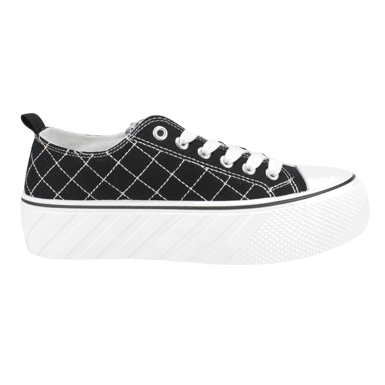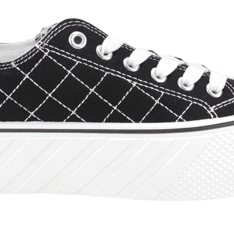 Zapatilla Mujer New Walk color negro. Estilo Urbano. Diseño de capellada en lona con detalles de costuras cruzadas a lo largo del calzado con punta de goma y detalles en relieve en la planta. Ajuste mediante cordones planos blancos. Plataforma de 4 cm de alto y caña de 4,5 cm de altura.