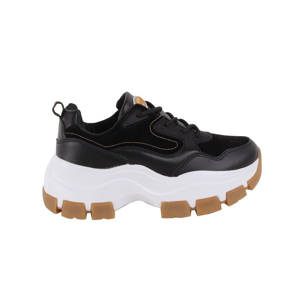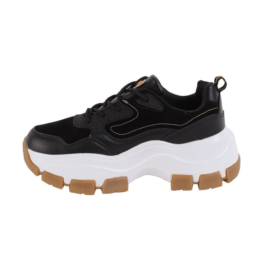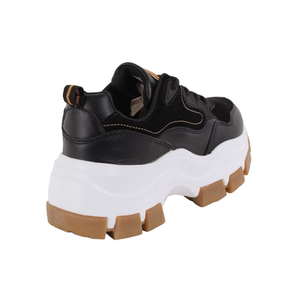 Zapatilla de Mujer urbana New Walk Chunky color negro. Capellada mixta, símil cuero liso y gamuza. Cordones redondos al tono. Plantilla confort ideal para el día a día. Plataforma color blanco de 6,5 cm de alto y caña de 6 cm.