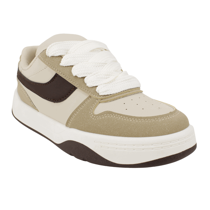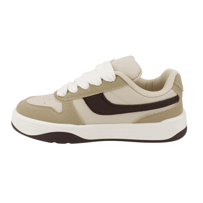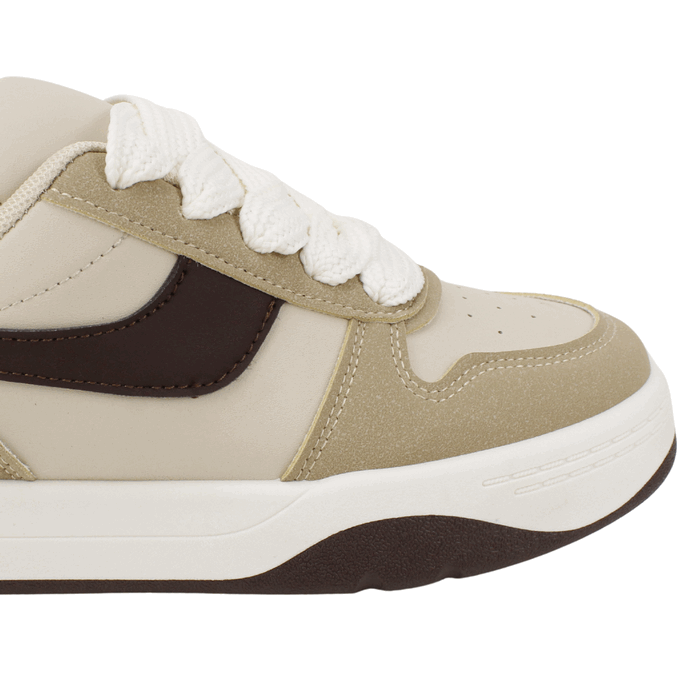 Zapatilla de Mujer New Walk color beige. Estilo Urbano. Marca tendencia con estas zapatillas de diseño contemporáneo. Su paleta de colores neutros en beige y café los convierte en el básico perfecto para cualquier outfit moderno. El detalle estrella son sus agujetas gruesas tipo XL, que aportan un volumen único y un estilo audaz propio del mejor streetwear actual. Ajuste mediante cordones planos. Plataforma de 3 cm de alto y caña de 6 cm de altura.