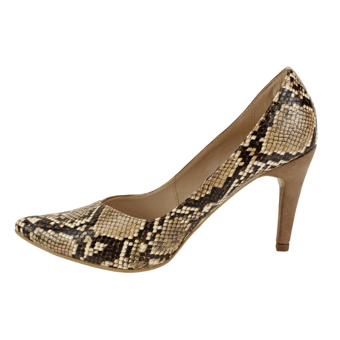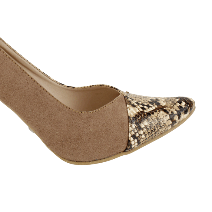 Zapatos de Mujer Exs de color beige, de fabricación colombiana. Estilo Fiesta. Fusiona la sofisticación y la audacia con estos stilettos bicolor. El contraste entre la suave gamuza beige y la textura de piel de serpiente en la punta afilada crea un diseño único y atractivo. Con un tacón cómodo y una silueta que alarga la pierna, este calzado es ideal para la mujer que desea un toque de distinción en su estilo diario o nocturno. Ajuste tipo Slip On. Taco Aguja de 9 cm de alto y caña de 6,5 cm de altura.