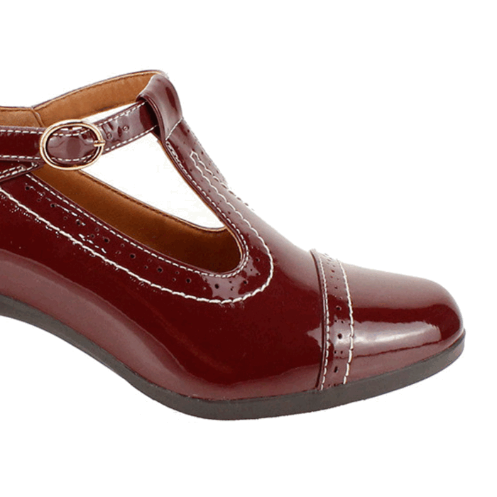 Zapato Mujer New Walk color Burdeo. Estilo Casual. Busca la sofisticación sin renunciar a la sujeción con estos zapatos de pulsera T en Símil charol negro. Un diseño funcional y elegante, con un tacón de bloque (o tacón grueso) de altura ideal para llevarlos todo el día con total comodidad. La pulsera ajustable al tobillo te dará la seguridad que necesitas en cada paso.