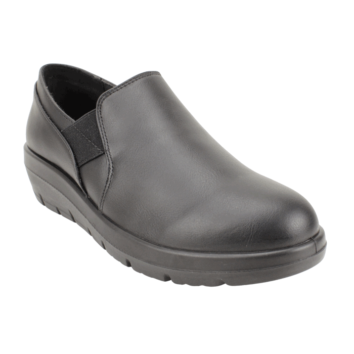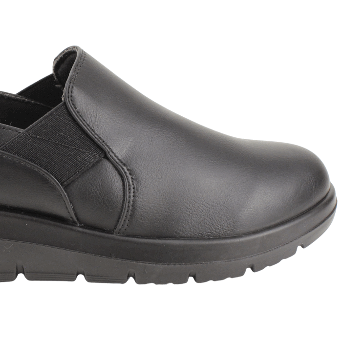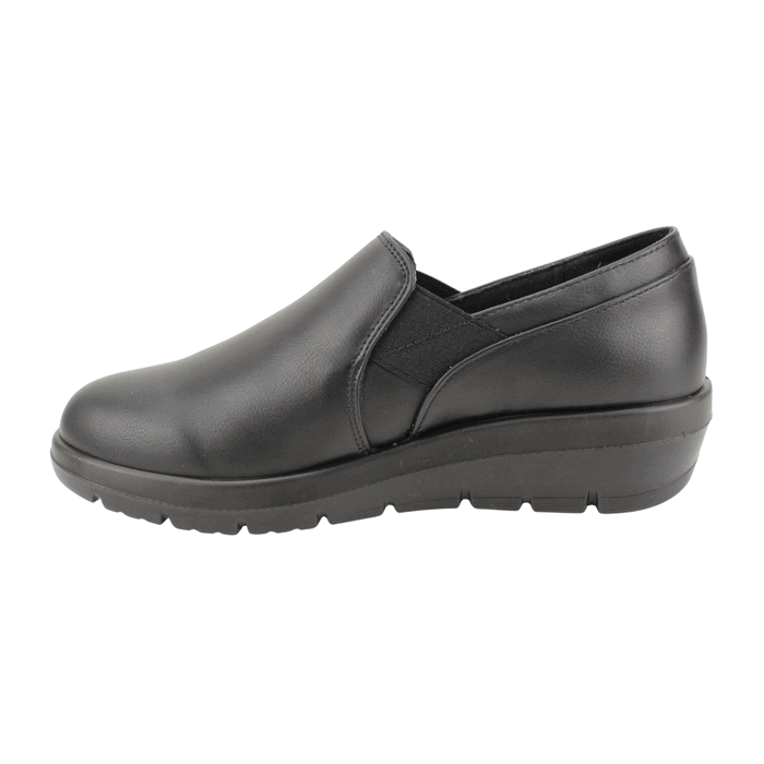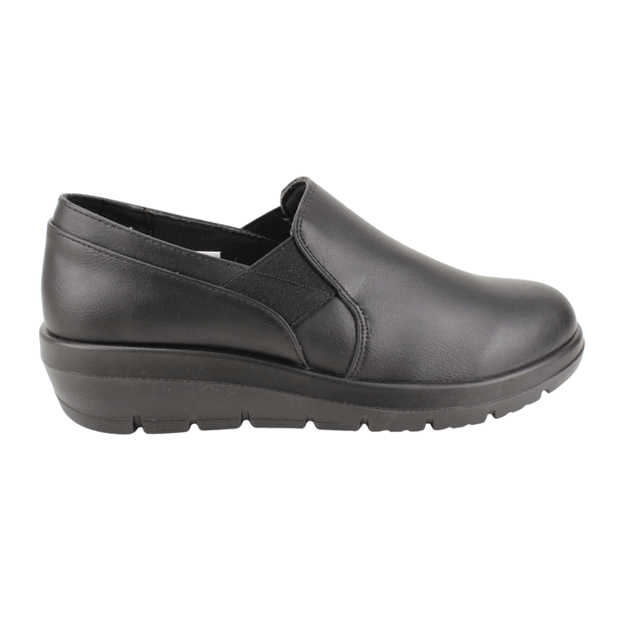 Zapato de Mujer New Walk color negro. Estilo Casual. Comodidad y practicidad se unen en estos zapatos slip-on para mujer en color negro. Su diseño clásico y atemporal, con una textura lisa y una banda elástica en los costados, facilita el calce y se adapta a tu pie. Con una suela de cuña baja que brinda soporte y amortiguación, son ideales para largas jornadas de trabajo, paseos o cualquier ocasión donde el confort es la prioridad. Plantilla confort con Memory Foam. Ajuste tipo Slip On. Plataforma de 4 cm de alto y caña de 6 cm de altura.